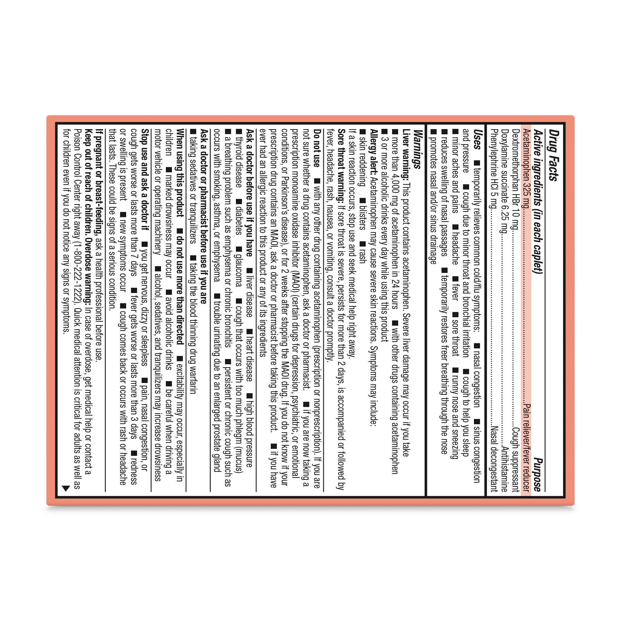 - ACTIVE INGREDIENTS: Contains acetaminophen, dextromethorphan HBr, doxylamine succinate, and phenylephrine HCl , the leading ingredients for nighttime cold & flu relief. Compares to the active ingredients in Vicks NyQuil Severe and is just as effective.