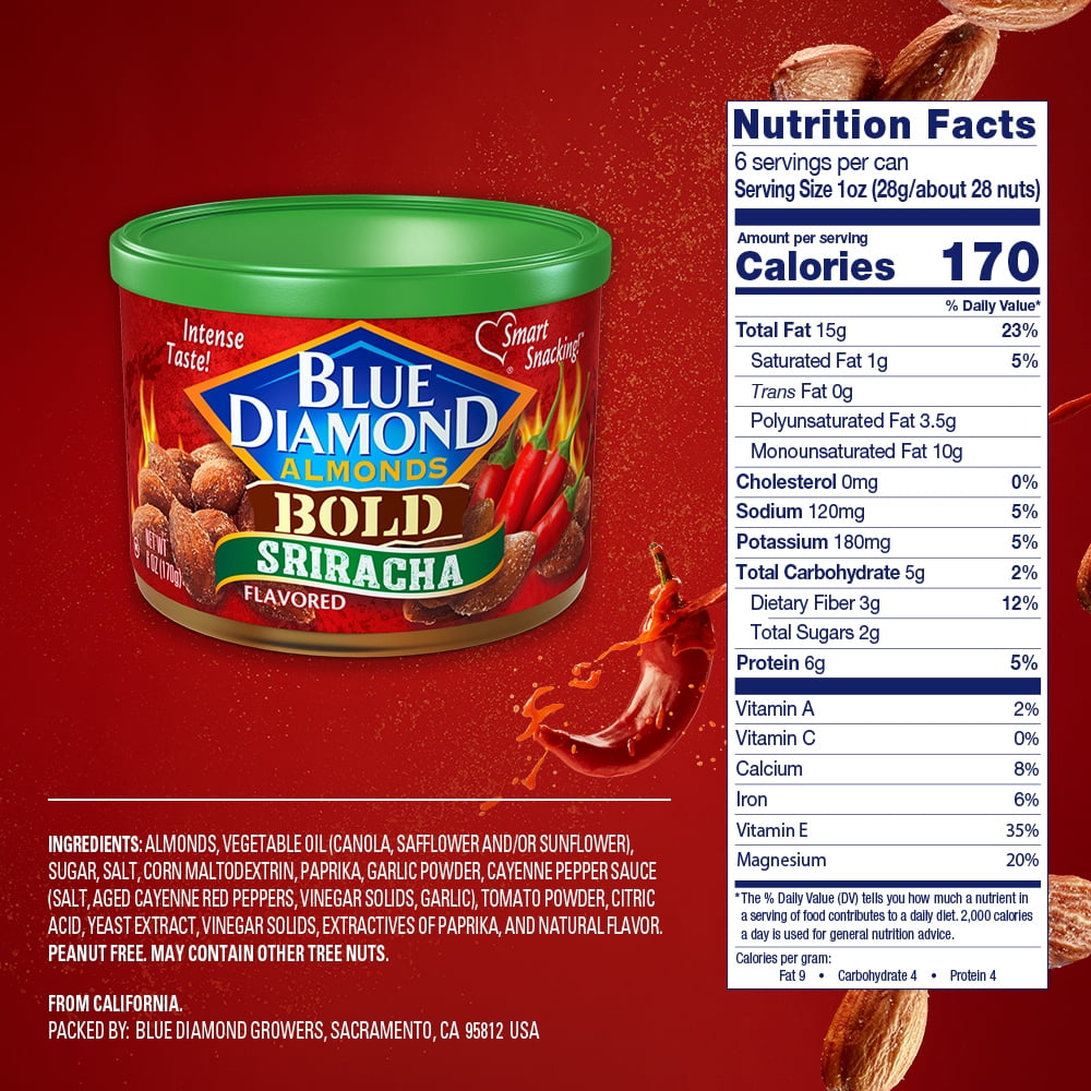 Our BOLD flavors our heating up with new Sriracha flavored almonds. Fans of the bold, complex flavors of Sriracha hot sauce can now experience that tangy heat on Blue Diamond Almonds. So pick up a can and kick up the heat.Blue Diamond Bold Sriracha Flavored Almonds 6 oz. Canister