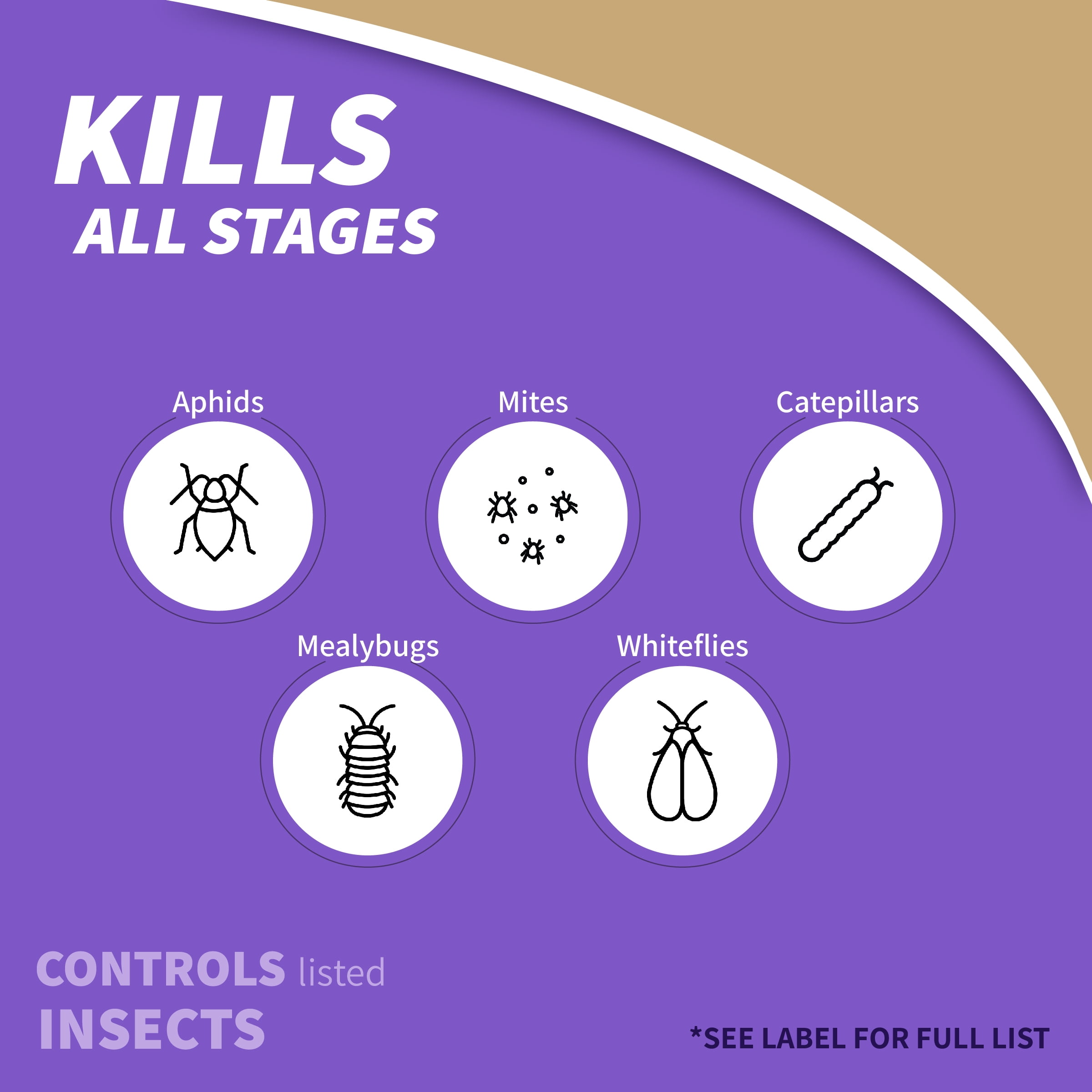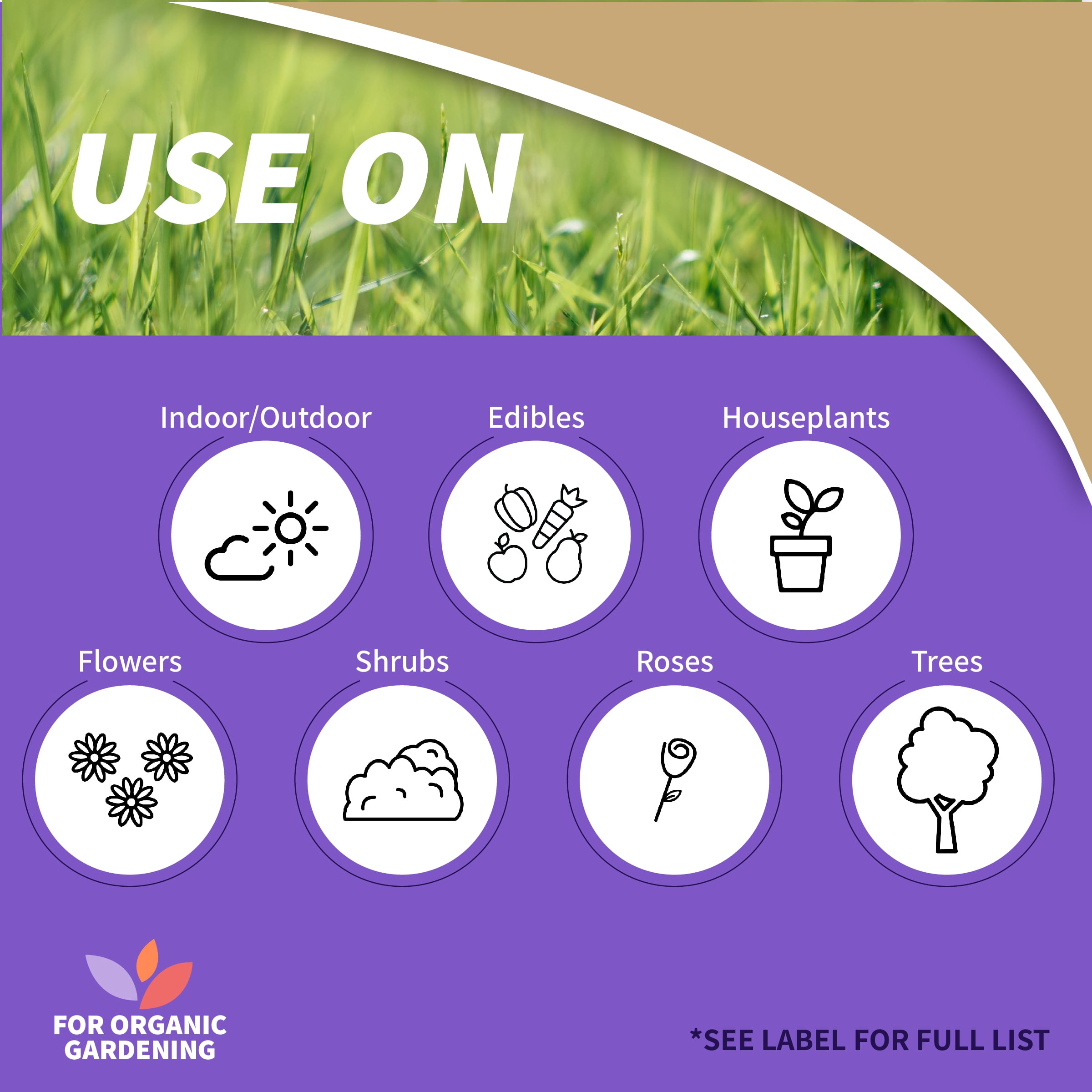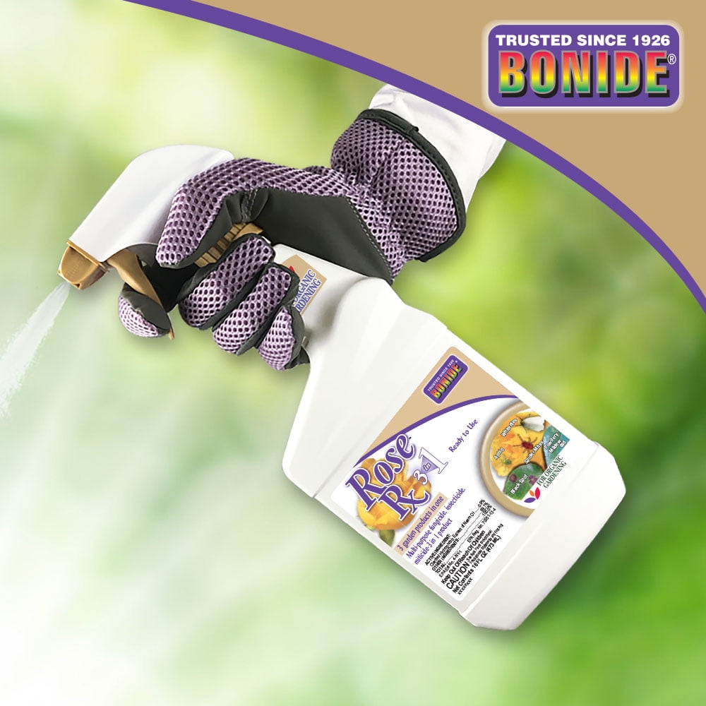 BONIDE 16 oz. Rose Rx (3-in-1) spray ready to use, insecticide, fungicide, miticide for organic gardening. Controls plant disease, mites and all stages of insect lifecycles. It kills eggs, larvae, and adult stages of insects. It is an effective fungicide for the prevention and control of various fungal diseases. Designed for use on roses, flowers, house plants and more in and around the home and home garden. This product is conveniently ready to use when it arrives. The spray nozzle makes this product easy to deploy.