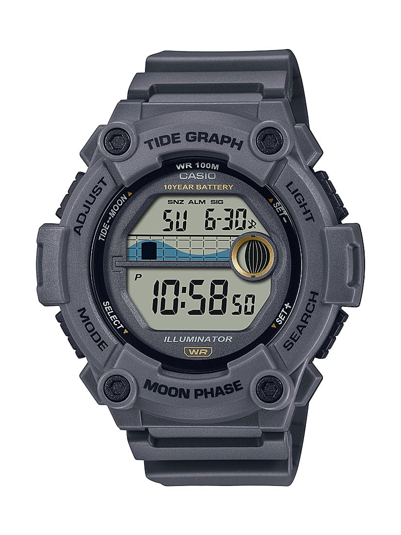 Water lovers take note! The ideal companion for anyone into marine sports. The Casio WS1300H-8AV starts with a durable gray resin exterior design, 100-meter water resistance, and 10-year battery life. Then add on-board tide graph, moon data, and LED light ensuring an easy read even in the dark, to deliver everything a water sports enthusiast needs, right at your fingertips. With stopwatch, timer, and alarm, these versatile timepieces take you seamlessly from home or office to the pool or ocean.