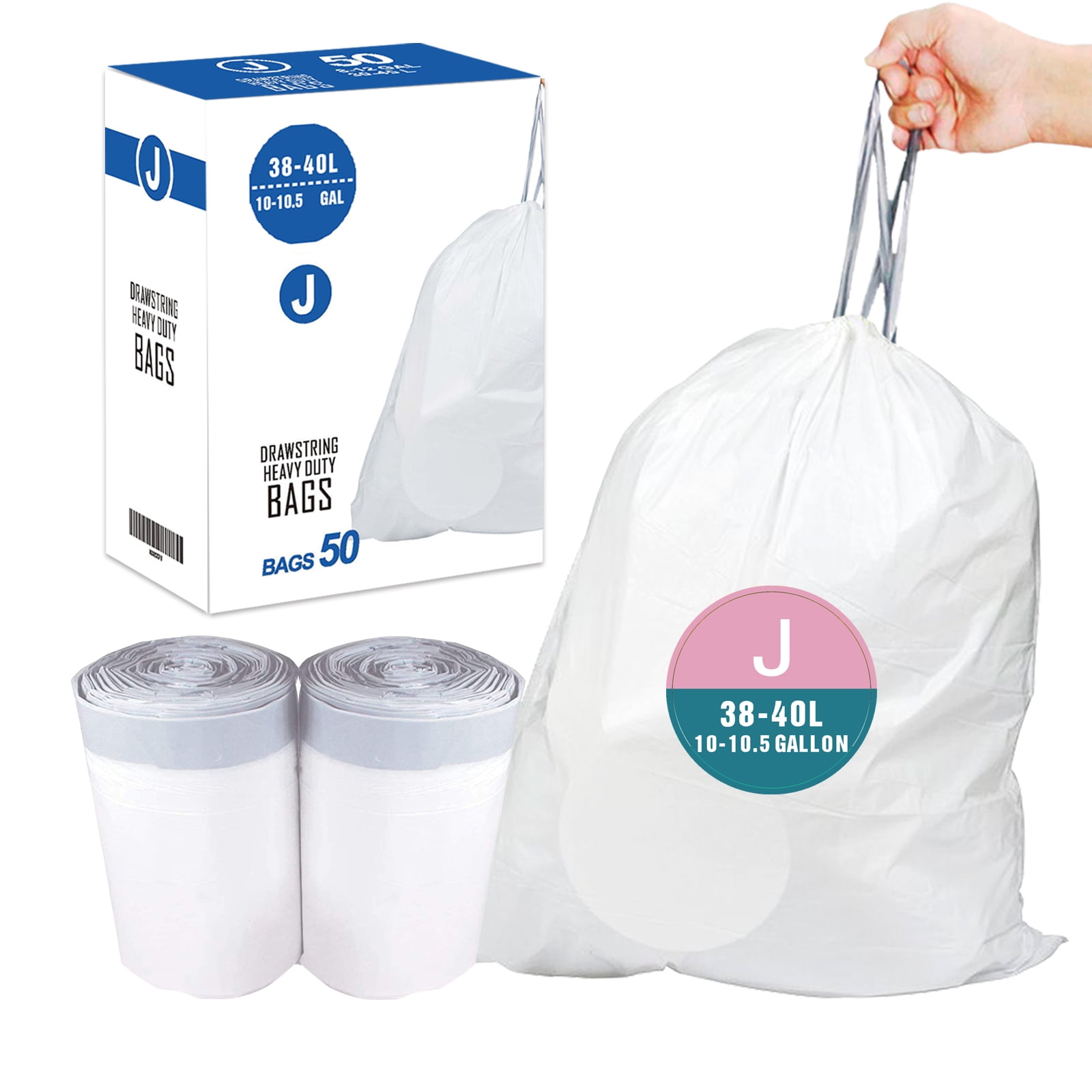 Code J (50 Count) 10-10.5 Gallon Heavy Duty Drawstring Plastic Trash Bags Compatible with Code J | 1.2 Mil | White | 10-10.5 Gallon/38-40 Liter