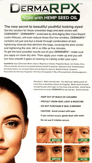 The secret to beautiful youthful-looking eyes! Get the best solution for those unwanted bags and dark circles with Derma RPX. Derma RPX, endorsed by anti-aging skincare expert Leslie Nifoussi, will get rid of those fine lines and wrinkles. Derma RPX contains a breakthrough combination of skin tightening minerals that diminish the bags, cover dark circles, and tighten the skin. All in as little as five minutes! For the best possible results, make sure you apply on clean, dry skin with the easy-to-use contour tip. Wear underneath makeup for smooth, flawless under eyes and no caking! A perfect product to add to your skincare arsenal.