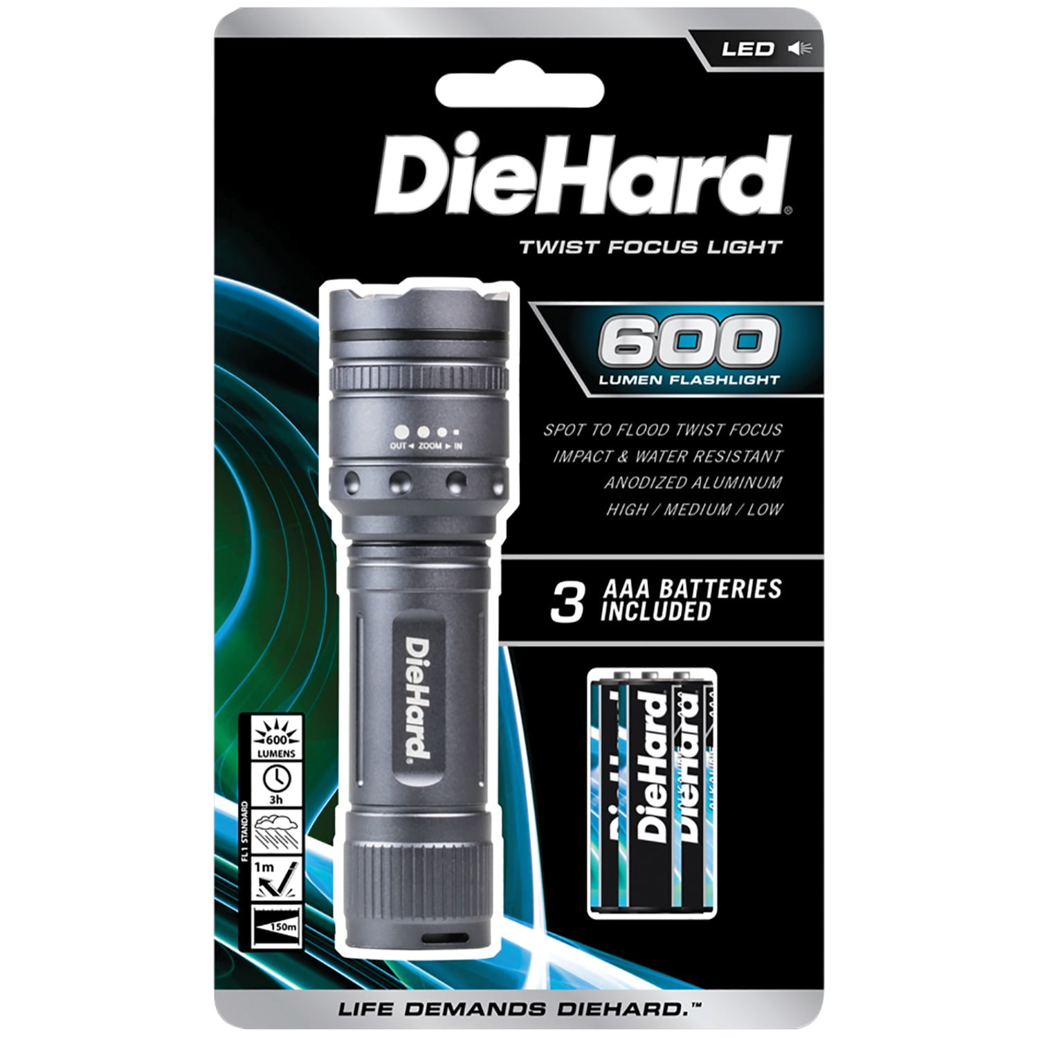The DieHard Twist Focus Flashlight features durable Pro Grade anodized aluminum construction for a quality feel and finish. With an impact- and water-resistant design, rubber-booted tail cap switch, and a heavy-duty, non-slip True Grip handle; this light is ready for the toughest jobs. Twist Focus technology allows you to move seamlessly from a spot to flood beam and any point in between. Light settings of the high, medium, and low mean you will always have the right amount of light. A flash setting is also included for safety. Other features include 3 hours and 15 minutes of run time on 3 AAA batteries and 600 lumens of power. This light is also designed to stand on its end for hands-free lighting. The DieHard Twist Focus Light includes three premium DieHard AAA batteries.