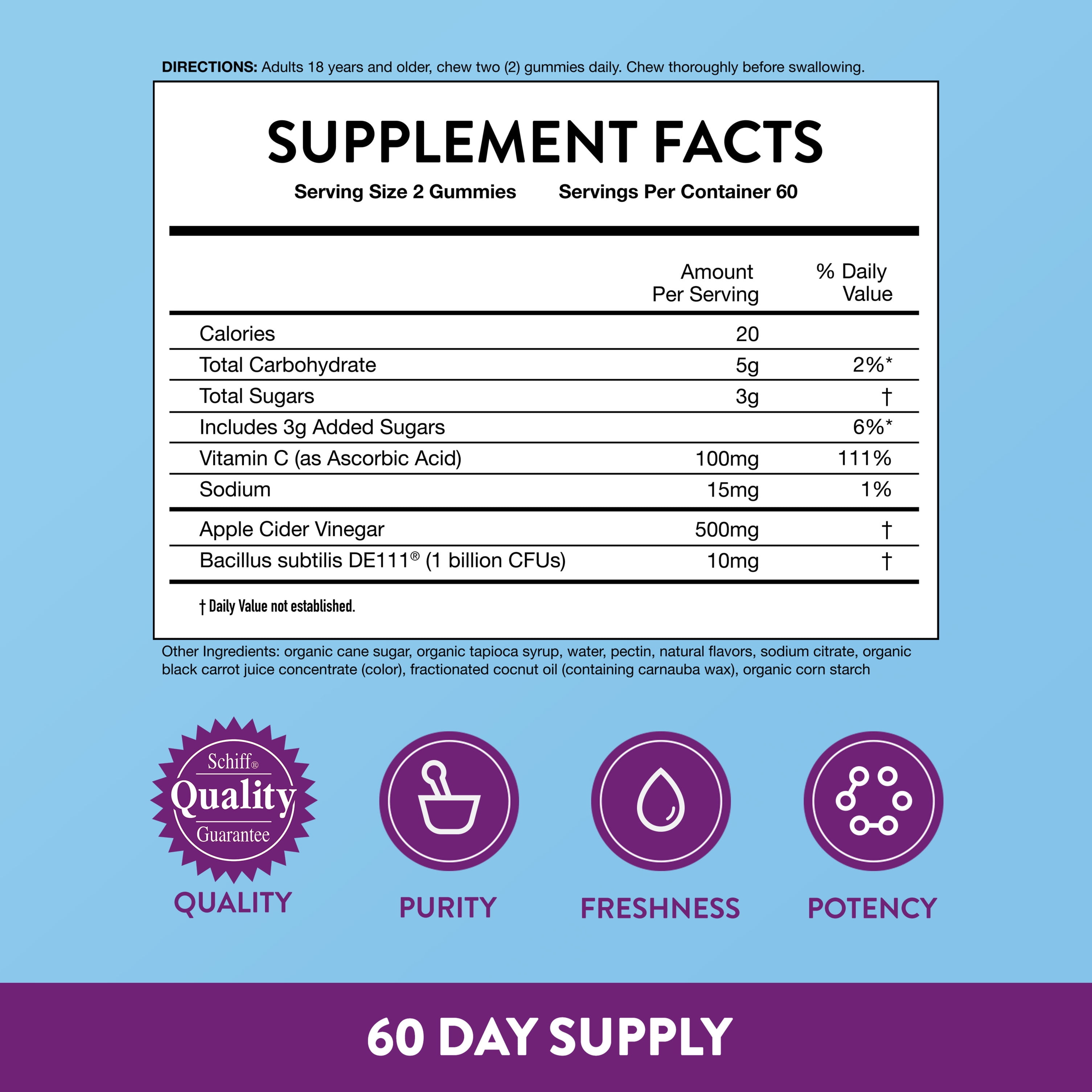 Digestive Advantage Daily Probiotics with Apple Cider Vinegar are great tasting and has naturally sourced flavors with 500mg of Apple Cider Vinegar. The probiotic gummies also have 1 Billion CFUs of bacillus subtilis DE111® to help support digestive health* Not only that but these probiotic gummies contain over 100% of your daily value of Vitamin C to support your immune health.* Digestive Advantage is the #1 Probioitic Gummy Brand§. At Digestive Advantage we believe that digestive health is key to overall health and that digestive issues can put you at a disadvantage. For over 15 years, Digestive Advantage has been dedicated to your digestive & immune health by bringing you breakthrough and patented probiotic strains.* This probiotic is tested and meets our high standards for purity, freshness and potency (labeled potency of live cultures). DIRECTIONS FOR USE: Adults 18 years and older, chew two (2) gummies daily. Chew thoroughly before swallowing. *These statements have not been evaluated by the Food and Drug Administration. This product is not intended to diagnose, treat, cure or prevent any disease. §Based on unit sales L52W through 10/02/21.