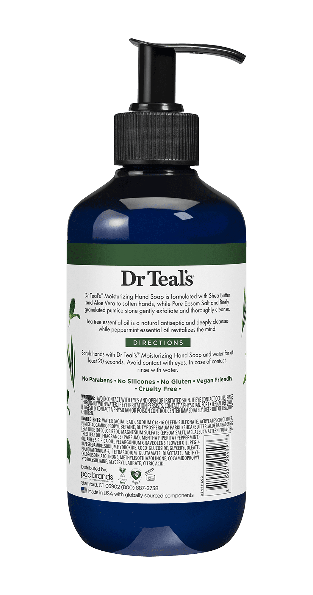 Keep hands clean and refreshed with Dr Teal’s Deep Clean with Tea Tree & Peppermint Essential Oils Moisturizing Hand Soap. Formulated with shea butter and aloe vera to soften hands and Pure Epsom Salt and finely granulated pumice stone to gently exfoliate and thoroughly cleanse, this liquid hand soap is gentle for everyday use. While lathering hands, aromatherapeutic tea tree and peppermint essential oils revitalize the mind. Dr Teal’s products are infused with essential oils to relax, replenish and rejuvenate your mind and body.