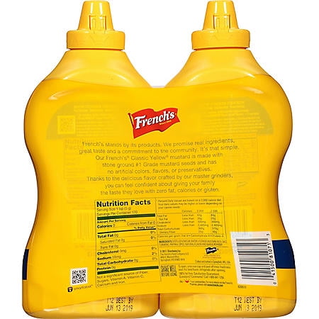 - French’s Classic Yellow Mustard contains no fat, calories or gluten