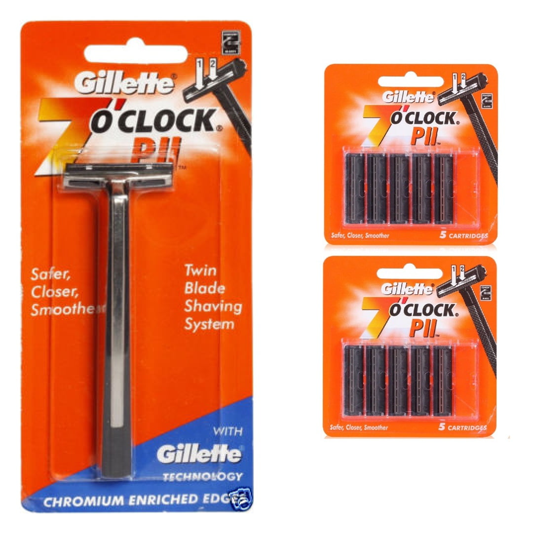 Refill cartridges for pivoting twin-blade shaving system. Pivoting twin blades stay on beard longer for extra closeness. Thes blades do not have a lube strip.Enjoy one of the best Track II razors on the market, the Gillette 7 O’ Clock PII razor. Paired with a total of 10 PII razor blades. Gillette 7 O’Clock twin blades keep both blades on your beard longer for extra closeness. Superior smoothness and comfort.