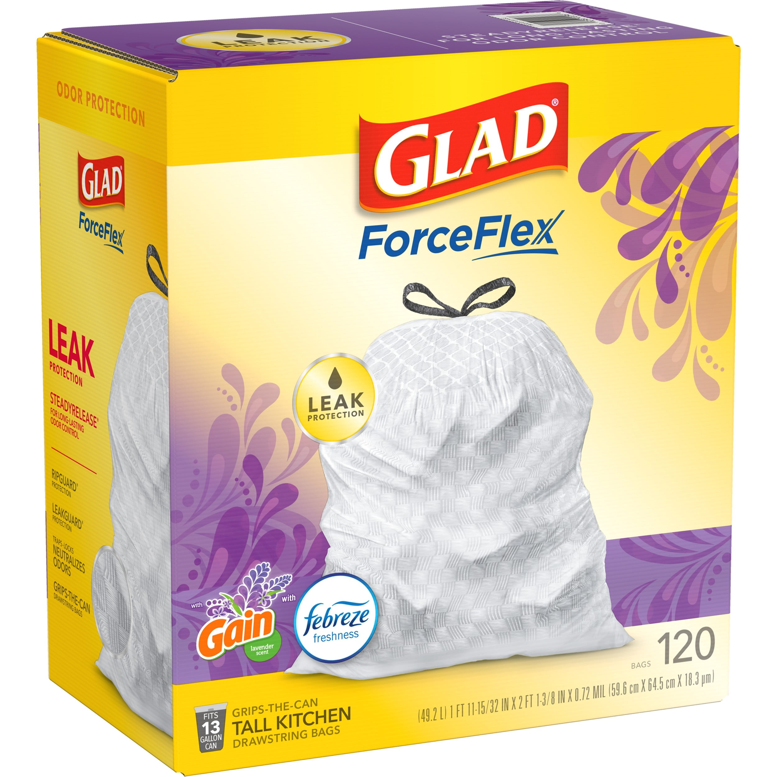 Fight nasty kitchen odors with the exclusive Glad trash bag combination of steady release Febreze freshness and irresistible Lavender scent only offered by Gain. Glad Tall Kitchen Drawstring Trash Bags are designed with ForceFlex technology to give extra flex as it expands around sharp edges and heavy loads, so you can pack it in while resisting tears, rips and punctures. These Glad trash bags leave behind a lasting Febreze freshness and a Gain Lavender scent. Let the stretchable strength of Glad ForceFlex handle all the messes our busy daily life can throw at it and then some. These trash bags are designed with RipGuard and LeakGuard technology to prevent seepage of liquids and keep trash contained. The durable Grips-The-Can Drawstring ensures a tight grip on the trash can to keep it in place. Take the trash to the curb with no fear of leaks and tears, and no frustration. Keep your kitchen smelling clean with the stretchable strength of Glad. Comparable to simple human H, Q, K, M, N, J liners and fit simple human trash cans. The durable drawstring ensures that the bag stays in place.