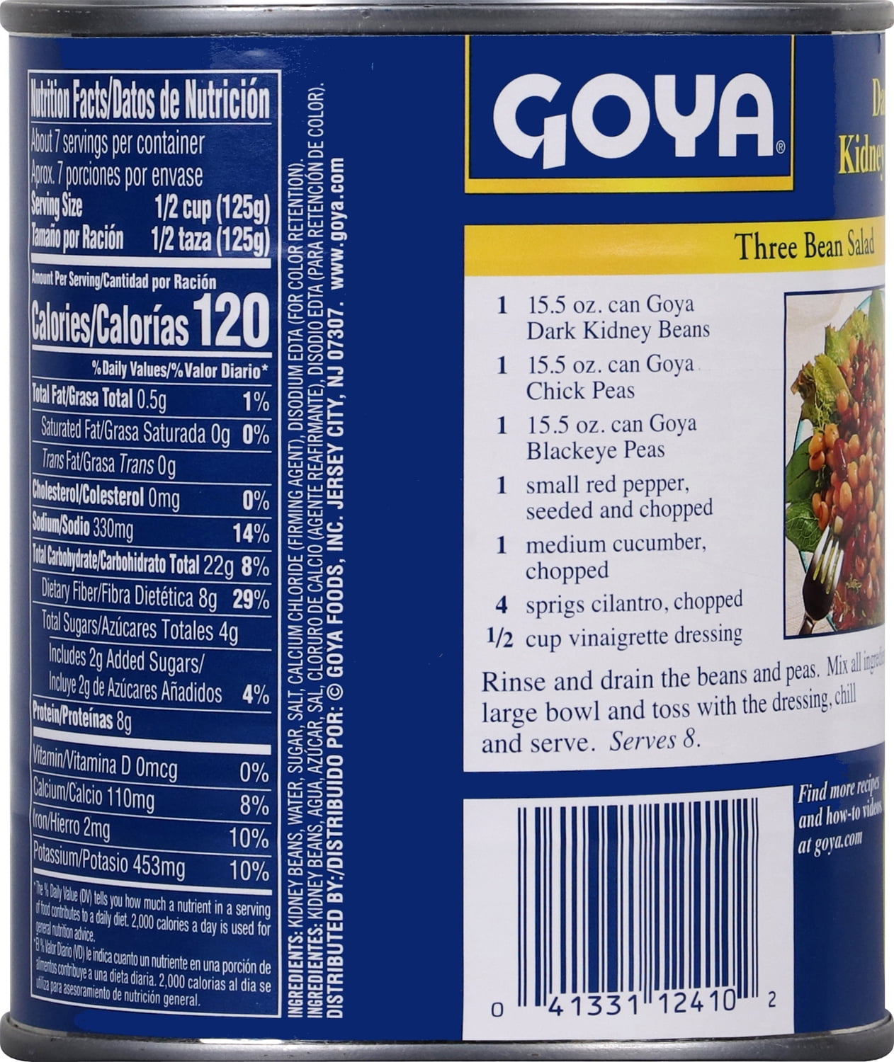 GOYA Dark Kidney Beans 29 Oz. These bright, plump and tender dark red kidney beans have an amazing robust flavor ideal for creating a variety of recipes like salads, chili, soups and stews. They’re packed with fiber, iron and potassium, and are gluten and cholesterol free. Try them!