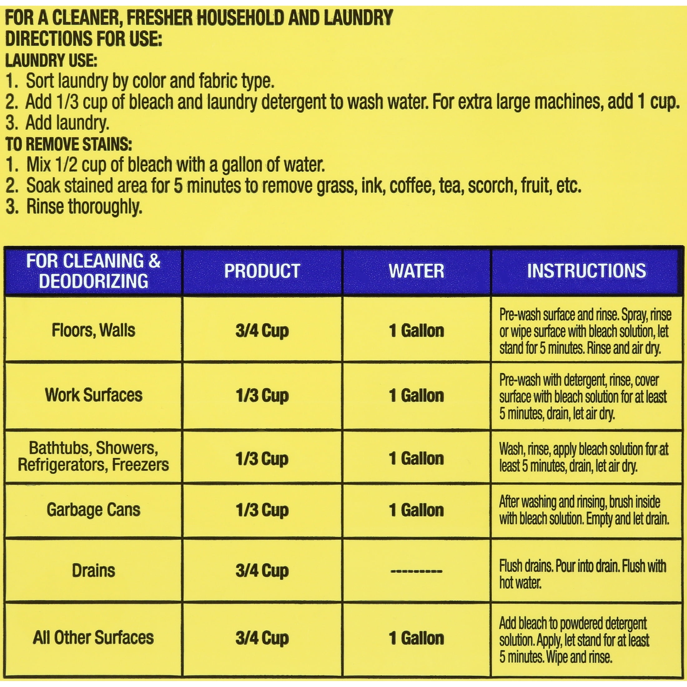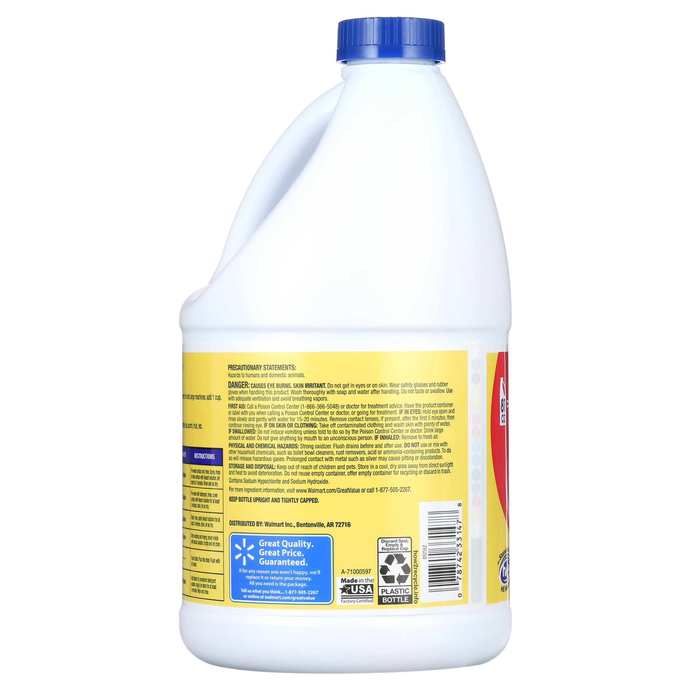 Fresher household. This cleaning bleach is designed to work with most standard HE washers and will keep your whites bright as it fights tough to remove stains. With a more concentrated formula, you get the same number of loads in a smaller bottle. Our lemon-scented cleaning bleach is also effective for cleaning, disinfecting, and deodorizing common household surfaces such as bathrooms, kitchen surfaces, dishes, and sinks. Leave your home looking clean and smelling fresh with our Great Value Lemon Scent Concentrated Cleaning Bleach. Great Value products provide families with affordable, high-quality grocery and household consumable options. With our wide range of product categories spanning grocery and household consumables, we offer you a variety of products for your family’s needs.