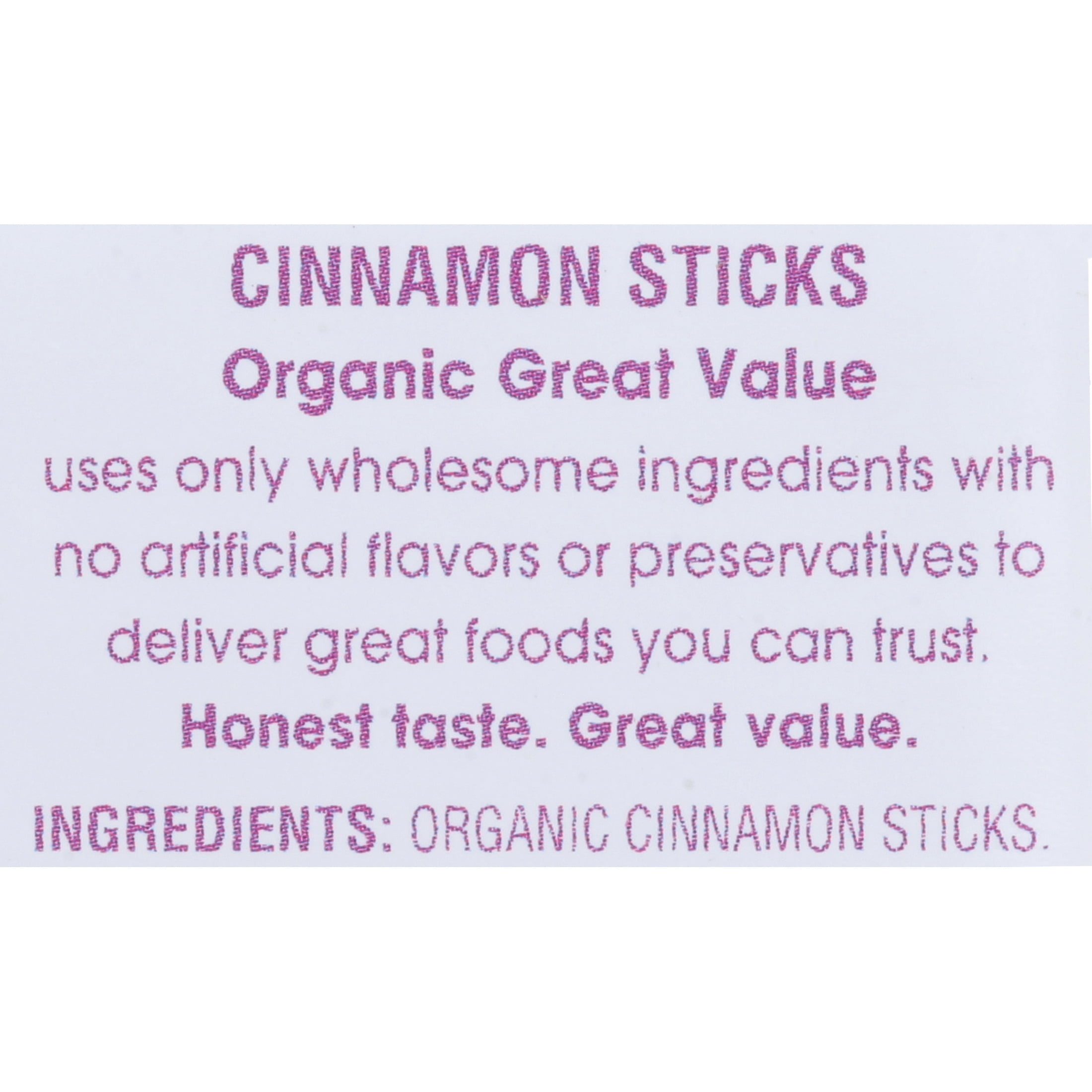 Great Value Organic Cinnamon Sticks are a fragrant and delicious way to bring your meals up a notch! Cinnamon is a flavorful and versatile spice that enhances both sweet and savory dishes. Use a stick to flavor slow-brewed teas, include one in the pot while cooking oatmeal, or add one to your slow cooker to add rich, complex flavor to meat dishes, broths, or grains. These USDA certified organic cinnamon sticks use only wholesome ingredients and contain no artificial flavors or preservatives. Bring warmth and depth to your recipes with Great Value Organic Cinnamon Sticks.