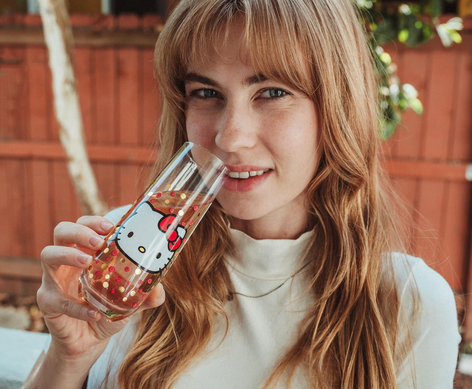 - A TASTE OF CUTENESS: One of the sweetest friends around, Hello Kitty appears on this stemless fluted glassware in adorable fashion. A colorful polka dot pattern decorates each glass, featuring Hello Kitty’s adorable face.