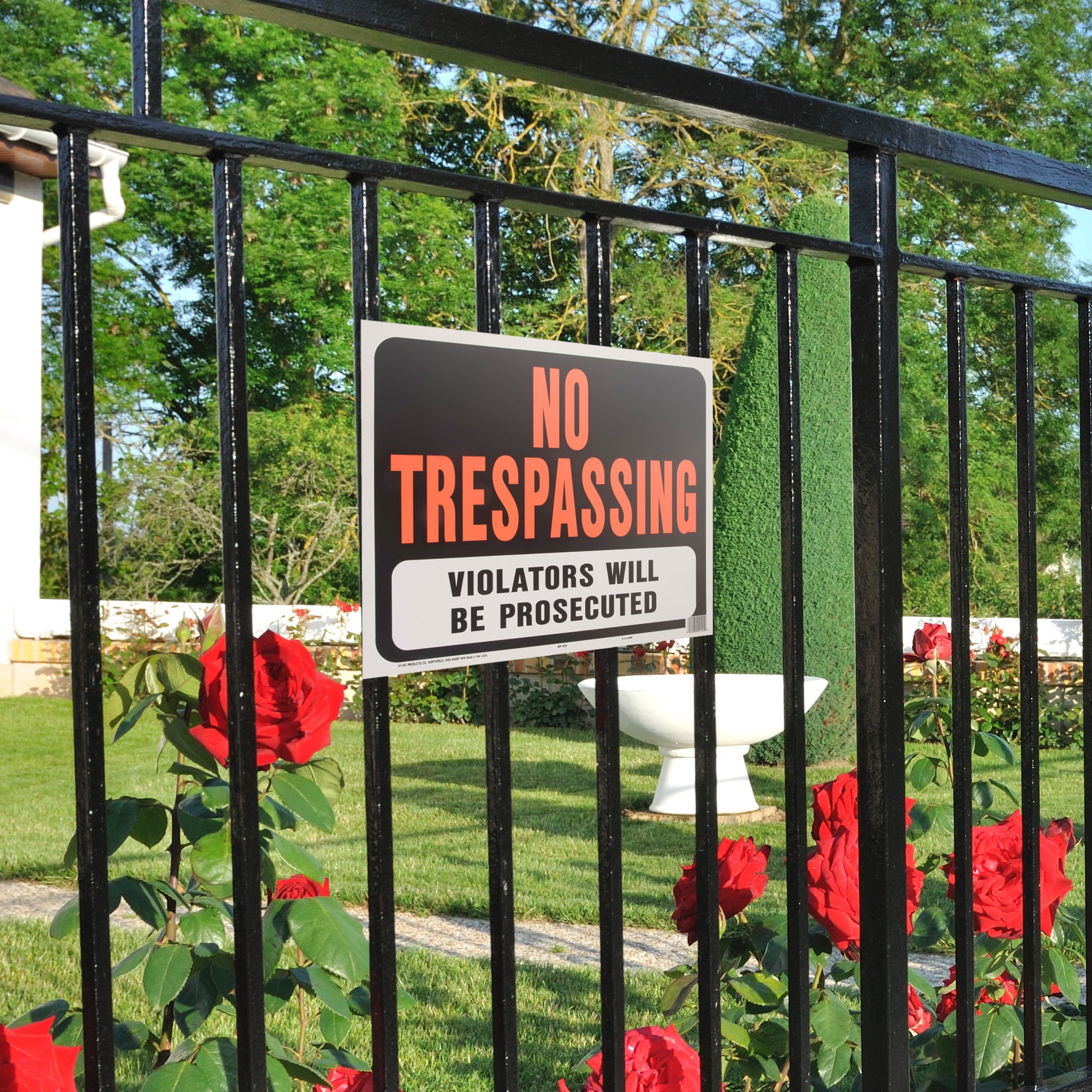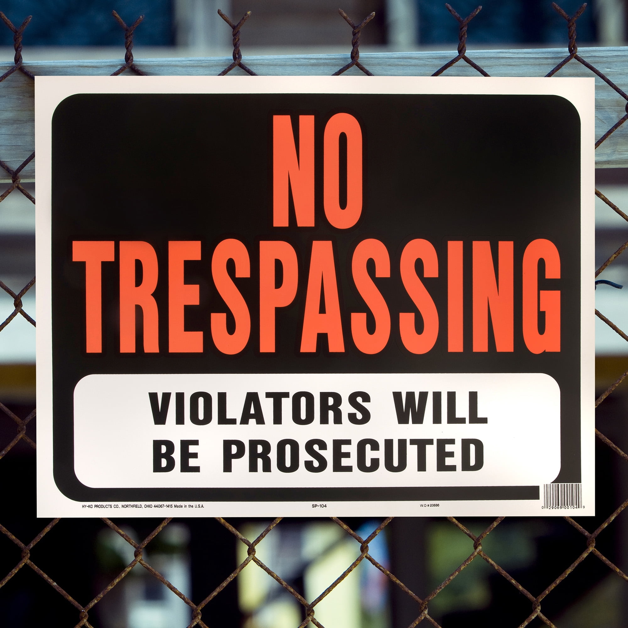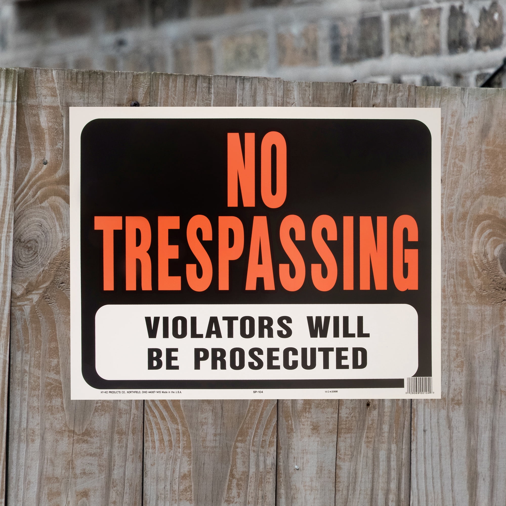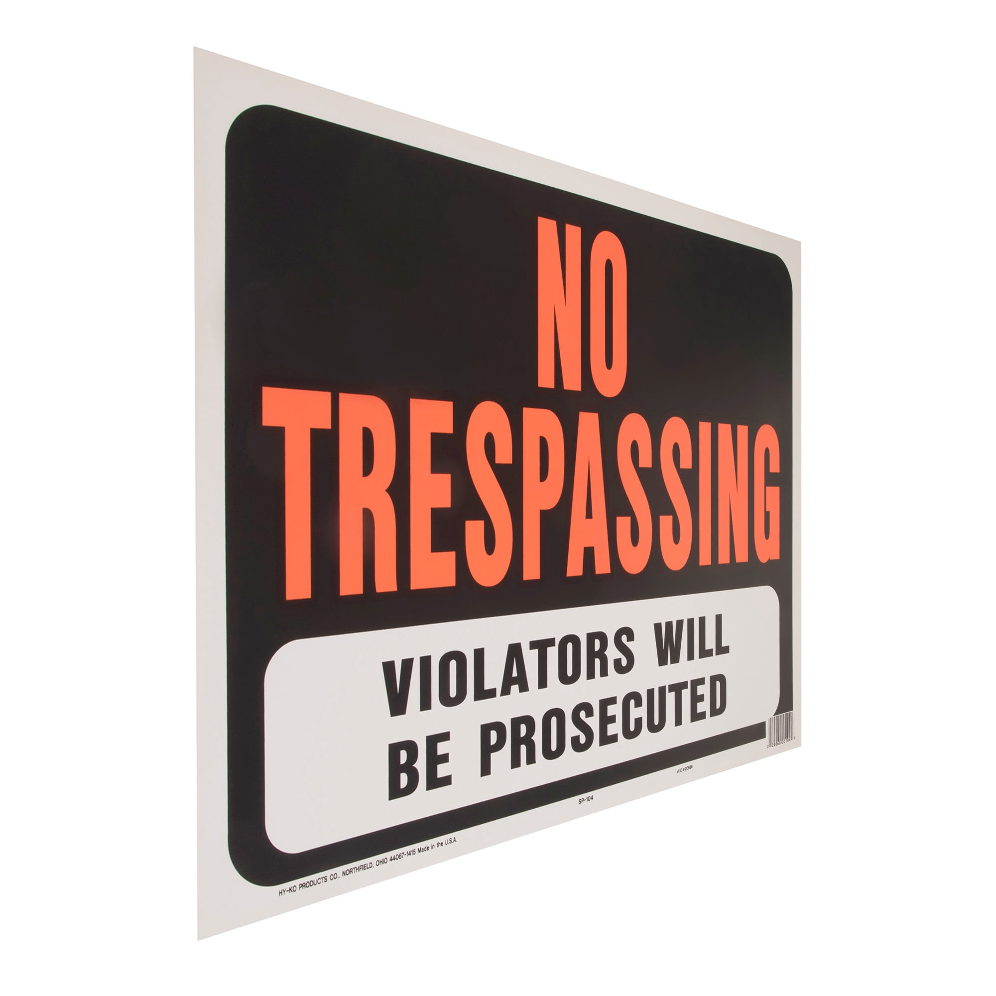 Uninvited guests on your land can be intrusive, disruptive, and sometimes downright dangerous. You have to alert people to where it’s safe to be and where it isn’t. Do it yourself and let them know with HY-KO! Start by getting a No Trespassing Sign from HY-KO, the industry leader in property sign design and manufacturing. Whatever warning you need for your house, fence, or property, we have a sign for it. You want your property signs to get to the point and stand out. This bold HY-KO No Trespassing Sign features attention-getting Hy-Glo neon orange letters on black background so it can’t be missed. Furthermore, this property sign alerts people that “Violators Will Be Prosecuted.” Anyone can easily attach the large warning sign to a post, tree, fence, or gate. Through our commitment to utilizing the latest methods and equipment to increase production efficiency, we are able offer our property safety signs at shockingly low prices that are sure to please any pocketbook. But don’t confuse “inexpensive” with “cheap.” This No Trespassing Sign is made from high-quality plastic, not paper like other warning signs on the market. This ensures the weather ability, durability, and longevity that customers have come to expect from HY-KO property and safety signs. We’ll be out there until as long as you need us. Get your HY-KO Jumbo Plastic No Trespassing Property Sign today at Walmart!