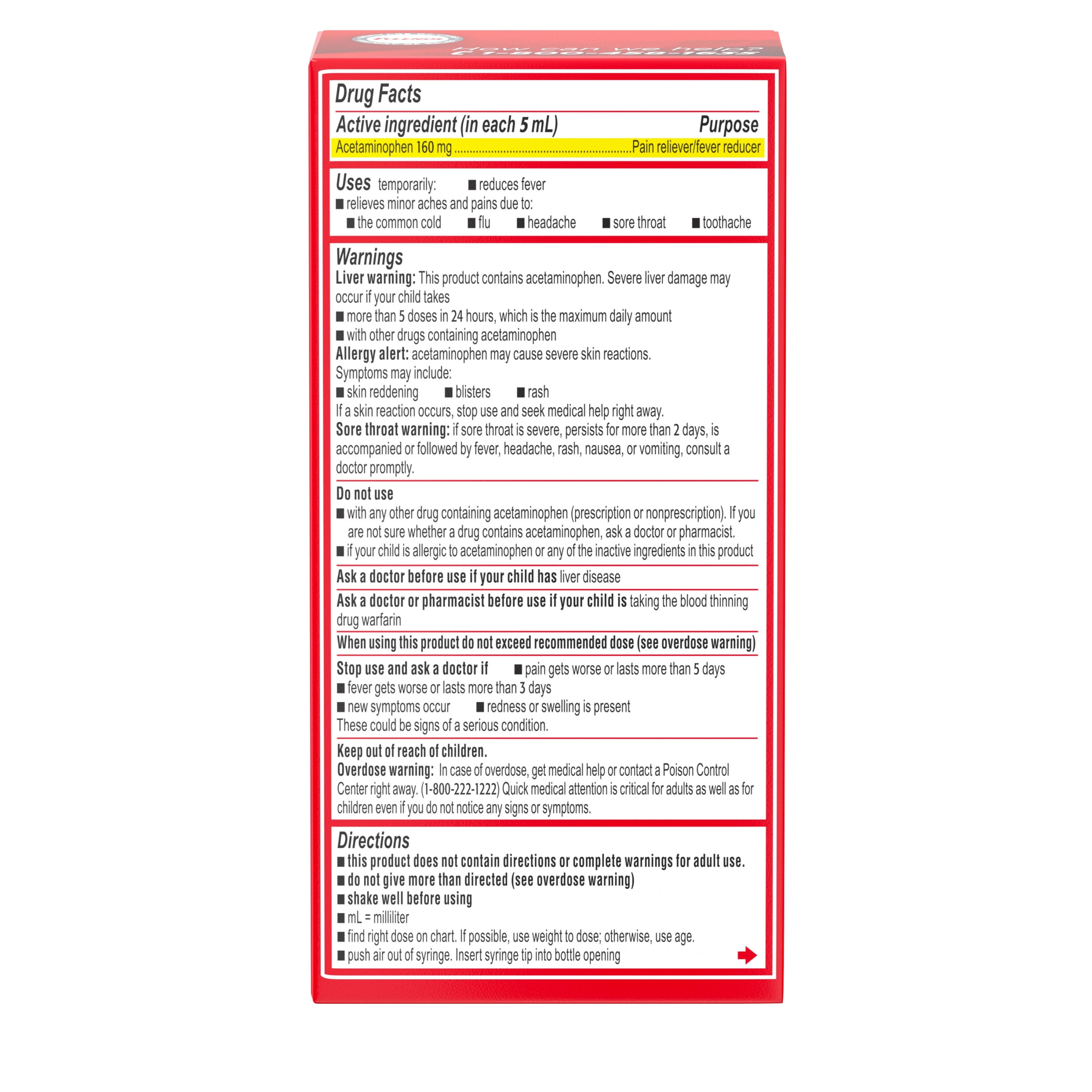- Each 5 mL dose contains 160 mg acetaminophen, a known fever reducer & pain reliever