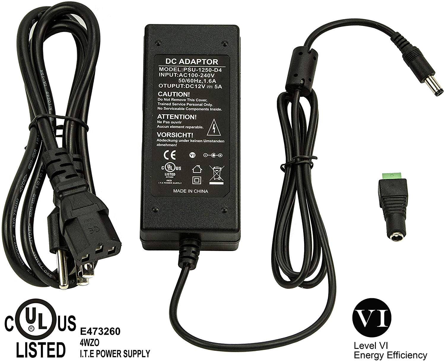 InstallerCCTV DC 12V 5 Amp Power Adapter is UL Listed and Level VI compliant. It is easy to use and compatible with LED Strip, Routers, ADSL CATS, Hubs, Switches, and Security Cameras requiring 5 amp or under.