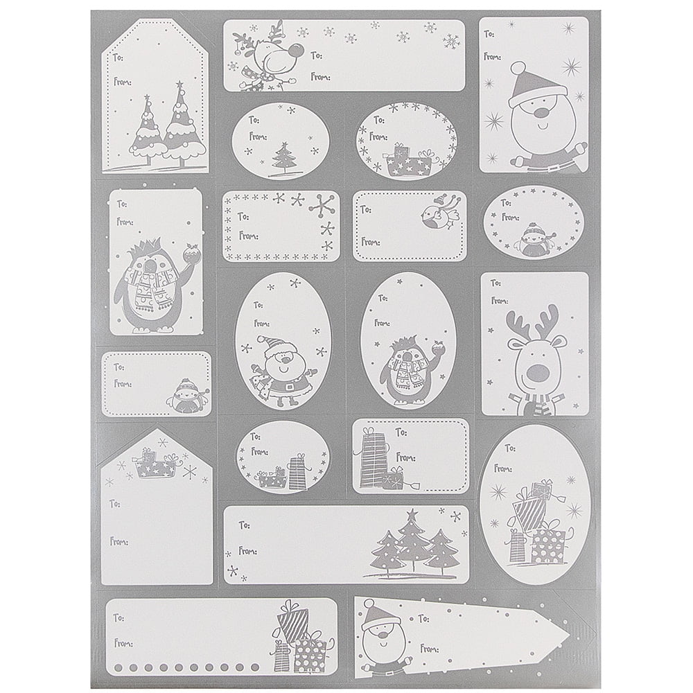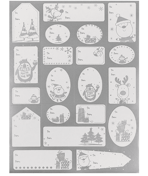 Each of these stickers is white with silver foil designs and details. The various fun holiday designs on these stockers include Santa, penguins, reindeer, birds, pine trees and gifts. Each one features the words "To" and "From" along with the appropriate blanks for writing names. This year’s Christmas wrapping will be incomplete without the labels designated who each gift is for and is from. These stickers will help you complete your gifts and give them an extra touch of shine.