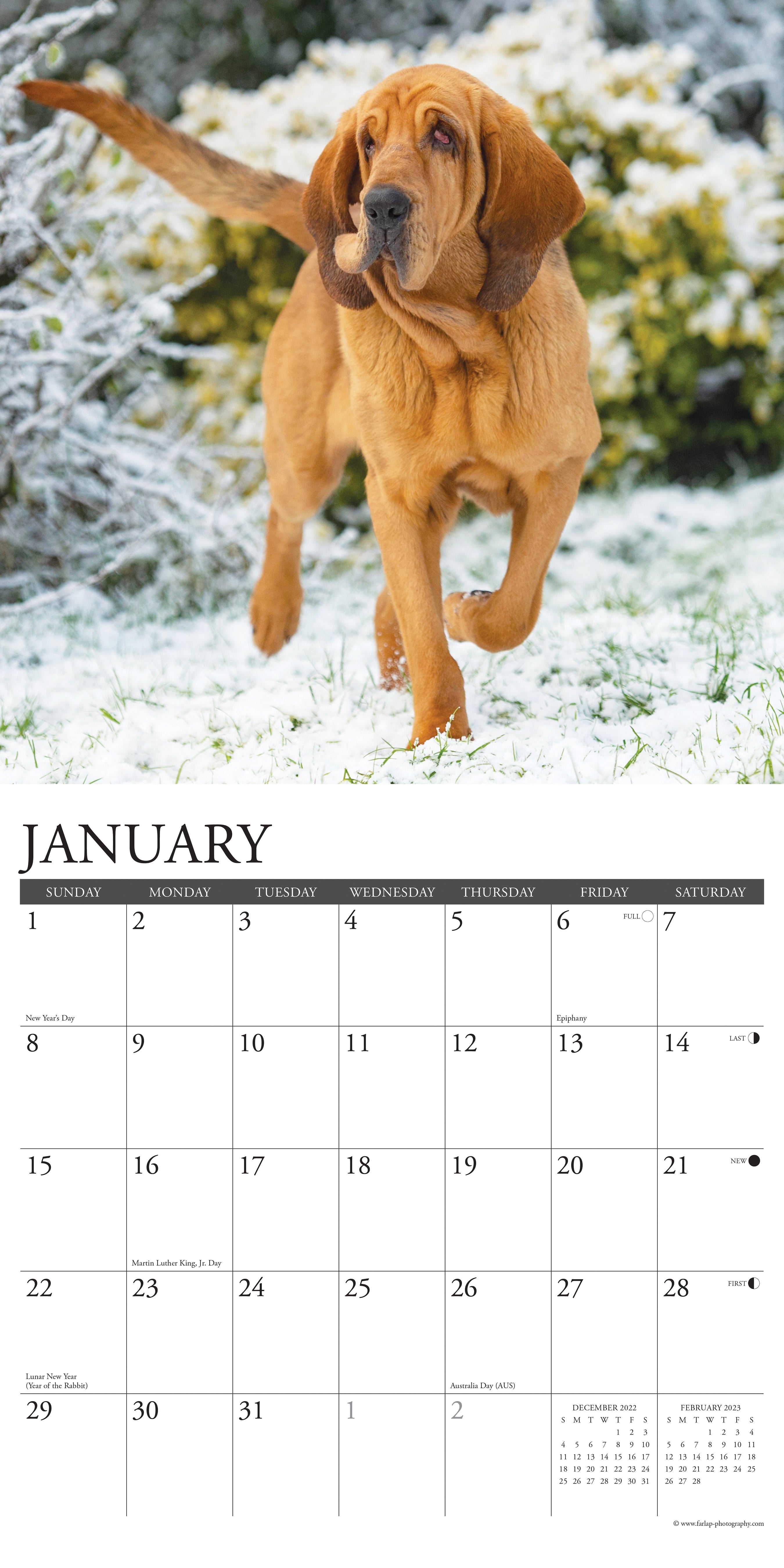 Big-hearted and big-boned with a nose that’s second to none, Bloodhounds are affectionate and friendly, with very little awareness that they may be slightly larger than the lap they’re attempting to sit on. They shed, slobber, and counter surf but those big sad eyes and floppy ears will get them out of almost any predicament. Printed with soy-based inks on FSC certified paper, this 12" x 12" wall calendar features large monthly grids that offer ample room for jotting notes, along with six bonus months of July through December of 2022. Also includes moon phases (CST), standard U.S. and international holidays.