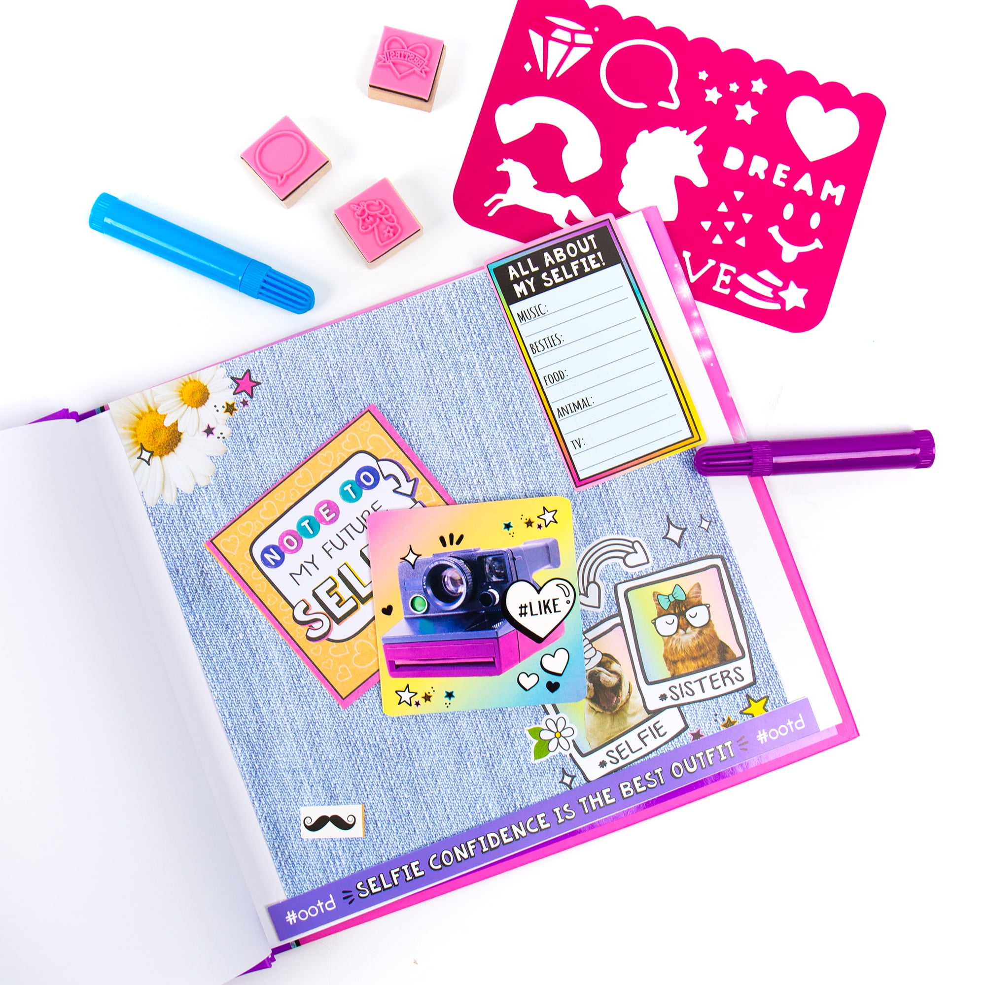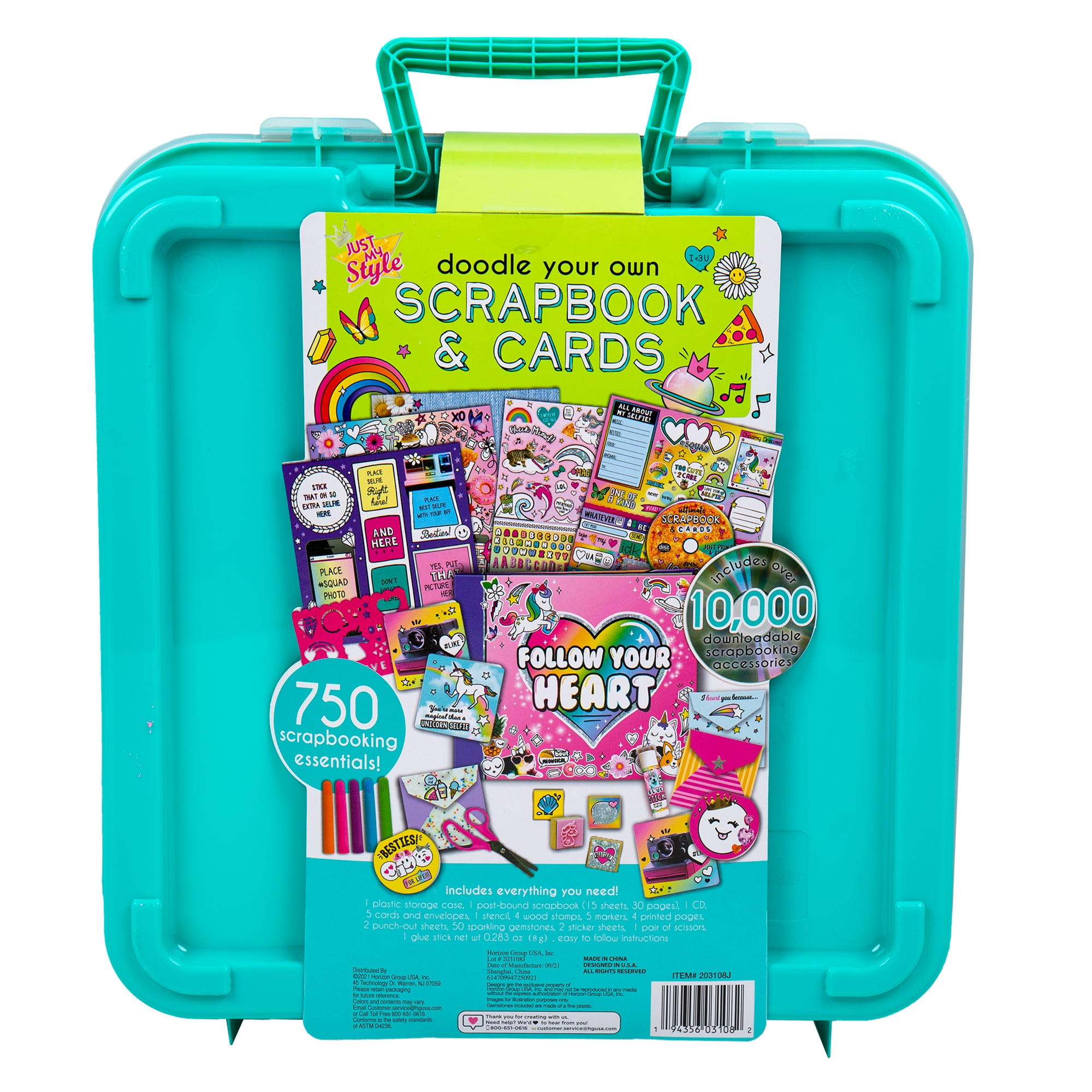 - Kit Includes: 1 Scrapbook (30 pages, 8 x 10 in.), 5 Cards and Envelopes (3 x 3 in.), 2 Sticker Sheets, 2 Punch Out Sheets, 50 Acrylic Gemstones (Orange, Fuchsia, Purple, Blue, Green), 4 Stamps, 5 Designer Markers (Purple, Pink, Blue, Green, Orange), 1 Ballpoint Pen, 1 Glue Stick, 1 Pair of Metal Scissors, 1 Stencil (4 x 6 in.), 1 Storage Case With Handle (13.75 x 3.25 x 14.25), Easy-To-Follow Instructions