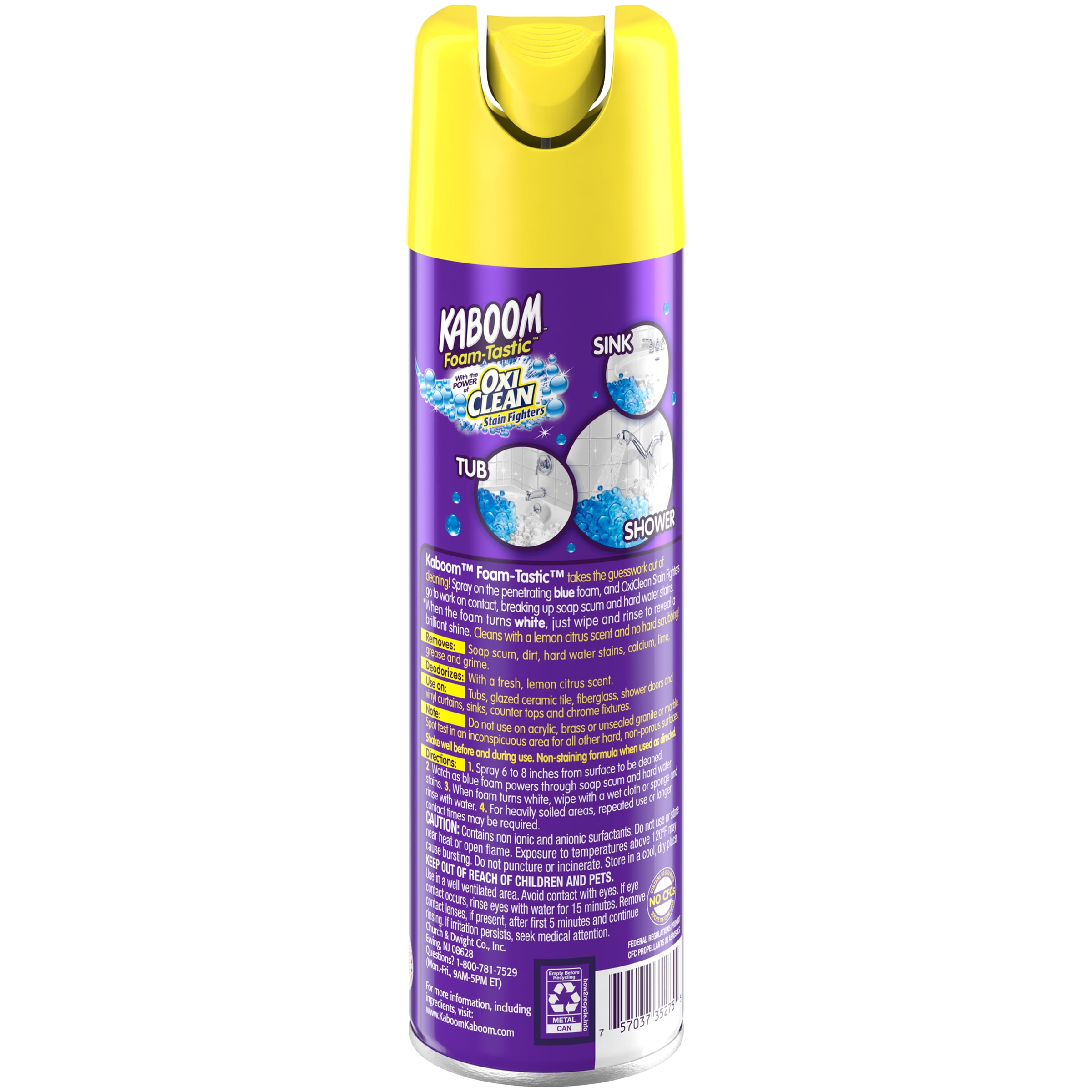 Kaboom Foam-Tastic with OxiClean Citrus Scent Bathroom Cleaner takes the guess work out of cleaning. Our color changing formula sprays on blue and turns white when its ready to wipe. Powerful OxiClean stain-fighting bubbles do the hard work and fight through soap scum, hard water, calcium and lime stains. All that’s left for you to do is easily wipe away to reveal sparkling clean surfaces. It’s 100% tough on dirt and grime with no hard scrubbing on you! Walking away from a bathroom that you know is clean – with a light citrus scent – is so satisfying! Includes one 19 oz. bottle of Kaboom Foam-Tastic with OxiClean Citrus Scent Bathroom Cleaner. At Kaboom, we’ve always been passionate about providing the best possible bathroom cleaning experience, our products are specially formulated to provide a clean you can see!