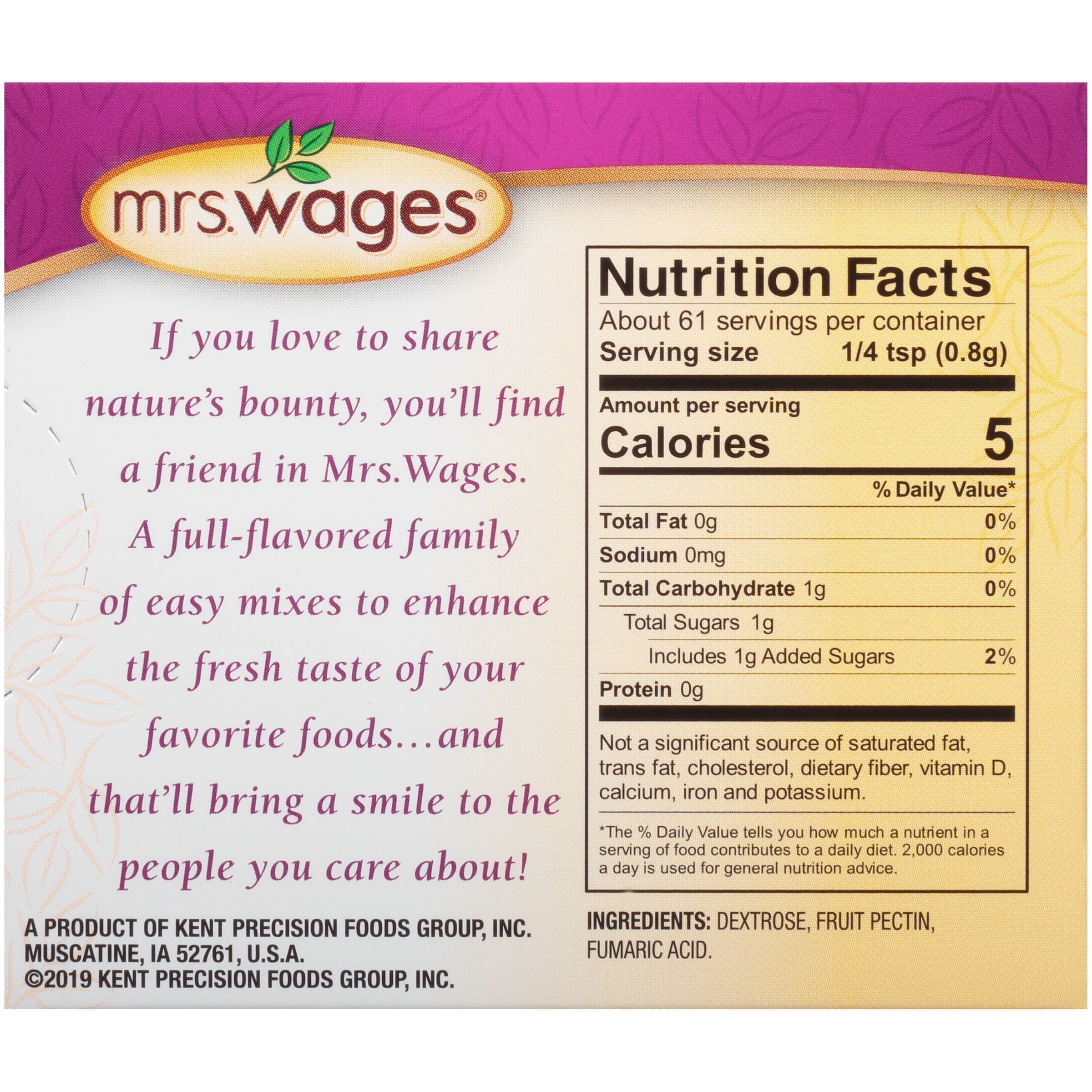 A fruit pectin used in making homemade jams and jellies. The Mrs. Wages Home-Jell and Light Home-Jell take much of the guesswork out of jelly-making and assure you of the finest results, even if this is your first attempt.