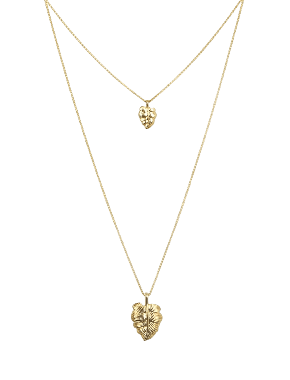Add a touch of nature to your look with this double layered necklace featuring leaf pendants dangling from two chains. Gold toned