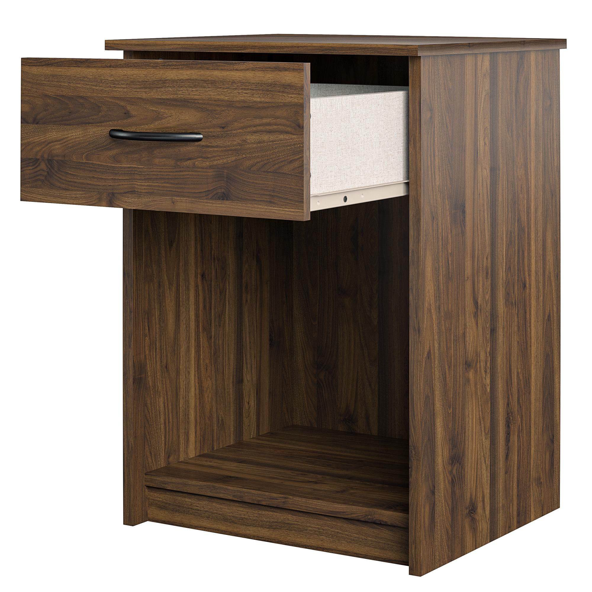 Keep your bedroom essentials within arm’s reach with the Mainstays Nightstand with Drawer. This Nightstand is a convenient addition to your bedroom as it not only provides extra storage space but the traditionally simple style and walnut woodgrain finish work with any existing decor. This Nightstand is constructed of laminated particleboard for a cost-effective build that is both trendy and functional. The Nightstand has a bottom cubby that can be used to store books or magazines while the drawer offers concealed storage. Use the top surface to place a lamp on or use it to display a few accessories for added style. The Nightstand ships flat to your door and requires assembly upon opening.