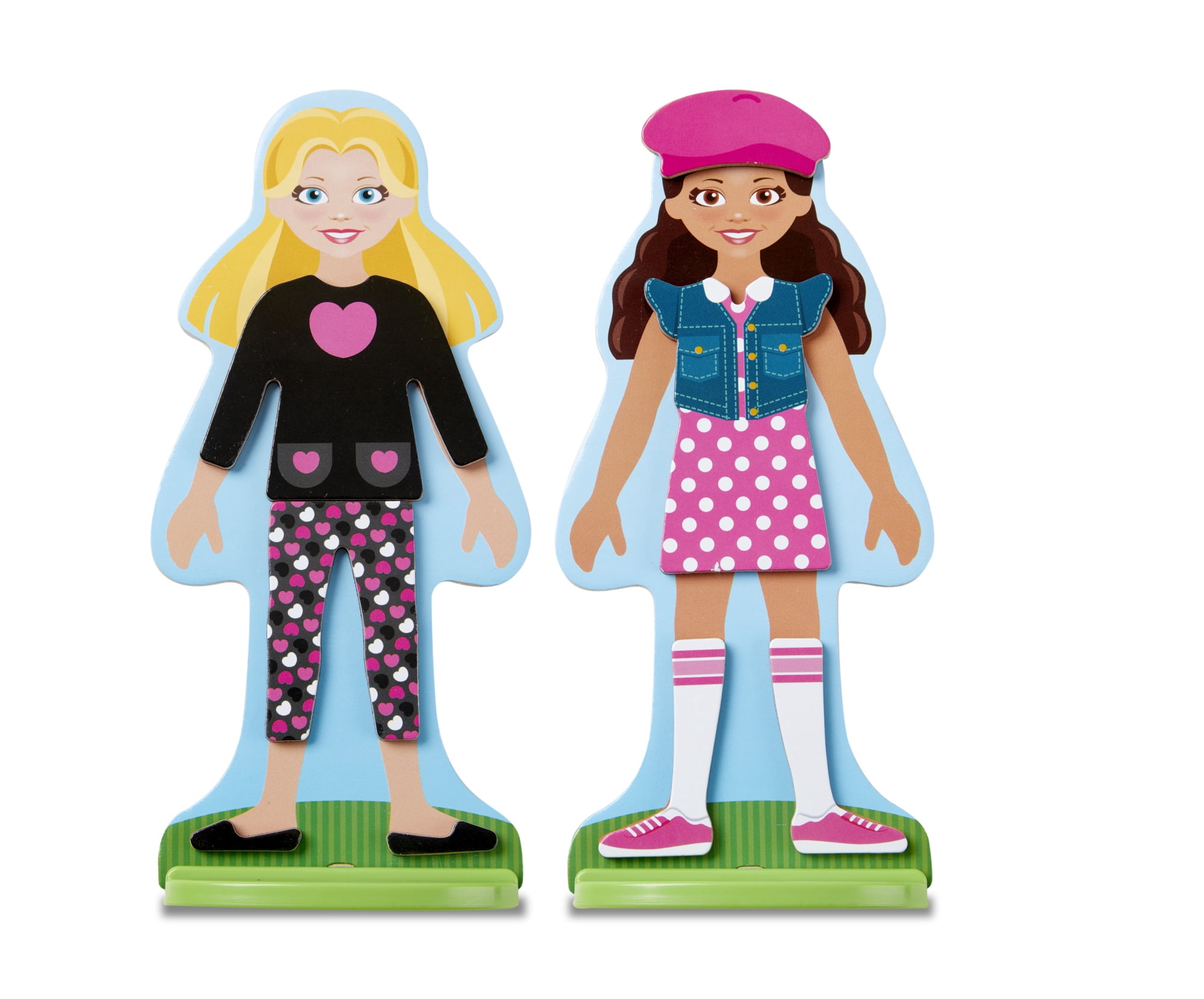 - Includes 2 wooden girl dolls, 2 durable doll stands, 42 magnetic clothing and accessory pieces.