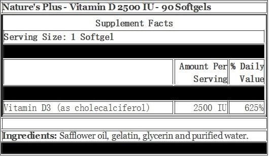 DescriptionThe Energy SupplementsDietary SupplementGluten FreeBioavailable D3 Active FormQuality, Natural SupplementNutritional support for healthy bonesMeets strict government safety standards for heavy metals and toxins, purity guaranteedAccording to the National Center for Health Statistics, over 35% of Americans are vitamin D deficient. Available in the most highly bioavailable form, Nature’s Plus Vitamin D3 2500 IU Softgels provide optimal levels of vitamin D in one easy-to-swallow softgel, allowing consumers to obtain the vitamin D support they require for healthy bones, in the rock-solid Nature’s Plus tradition. Nature’s Plus Vitamin D3 2500 IU Softgels:Support healthy bones naturally with Nature’s Plus Vitamin D3 2500 IU Softgels!Suggested UseAs a dietary supplement, one softgel daily.WarningsKeep tightly closed in a cool, dry place.Keep out of reach of children.Nature’s Plus Vitamin D3 – 2,500 IU – 90 softgels