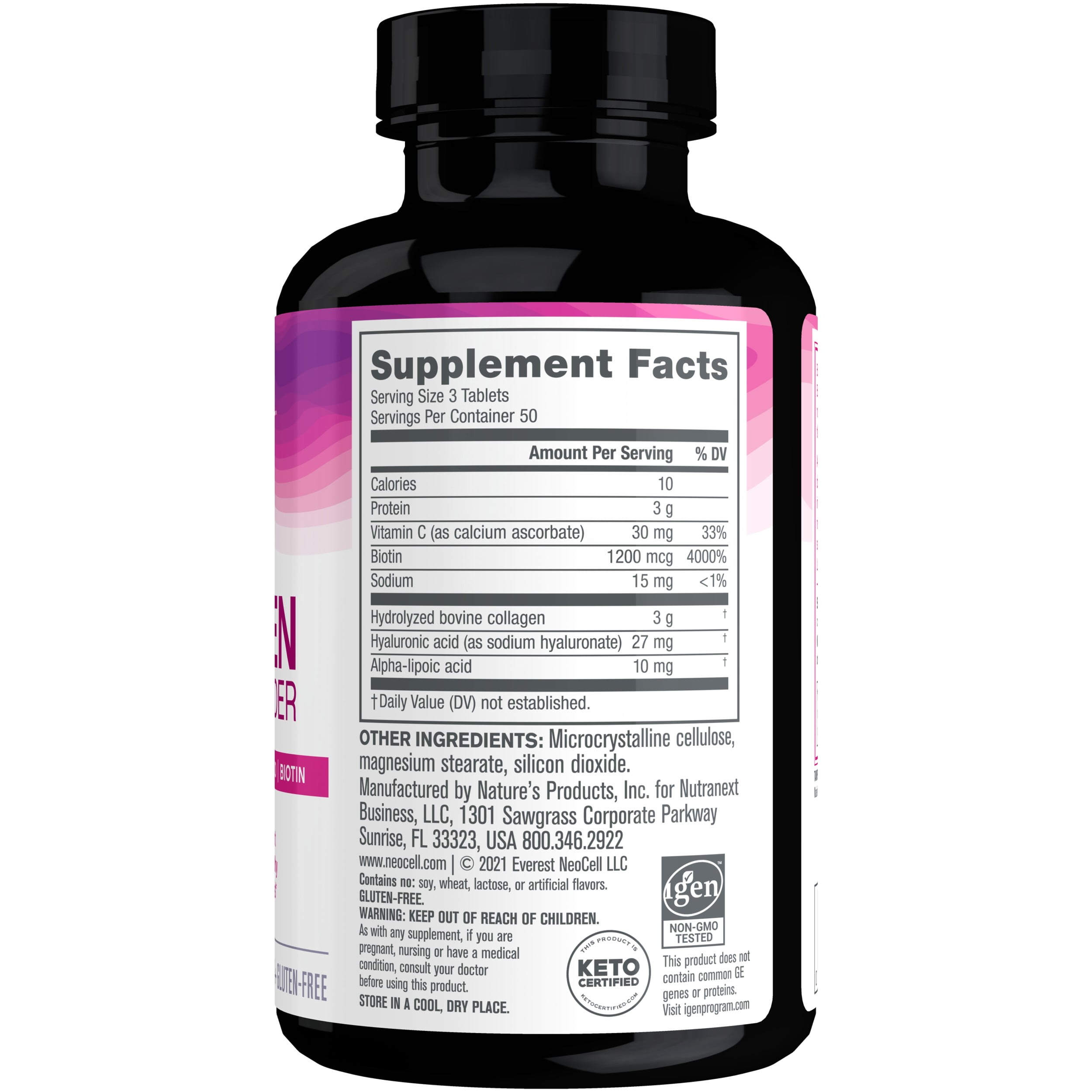 For inner strength and outer beauty, NeoCell Collagen Beauty Builder nourishes your body with critical, healthy nutrients to create beauty from the inside out.* It is a collagen supplement formulated with collagen type 1 and 3, hyaluronic acid and biotin for radiant skin, and healthy hair and nails.* NeoCell hydrolyzed collagen can provide some of the building blocks your body needs to make collagen and other proteins like keratin, which is found in our nails and hair.* Support healthy skin with NeoCell Collagen for women and men.* Hyaluronic acid is included to support skin hydration.* This water-loving nutrient is found naturally in the body, and hydrates the tissues and promotes elasticity. NeoCell Collagen Beauty Builder is made with grass-fed collagen and is gluten free, Keto Certified, IGEN Non-GMO tested, and has no soy, wheat, lactose, or artificial flavors.* Nourish your body and boost your beauty with just 3 collagen tablets a day.* *These statements have not been evaluated by the Food and Drug Administration. This product is not intended to diagnose, treat, cure or prevent any disease; This product does not contain common GE genes or proteins. Visit igenprogram.com