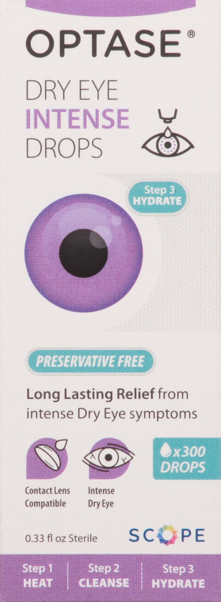 - Preservative free. Long lasting relief from intense dry eye symptoms. Intense dey eye. x 300 drops. Optase dry eye intense drops relieves symptoms of dry eyes such as itching and burning sensations. The Optase family of products are designed to deliver comfort and soothing relief