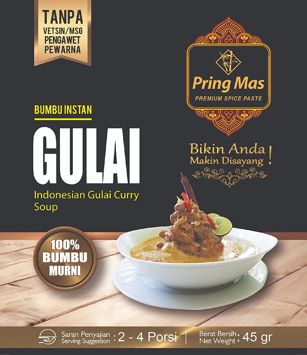 PPring Mas Bumbu Instan Gulai (Instant Seasoning Indonesian Gulai Curry Soup) NO MSG in 1.5oz (45g) pack. Bumbu Masak Instan Premium – PringMas diracik menggunakan bahan-bahan bumbu alami asli Indonesia dan dikemas menggunakan kemasan kedap udara agar terjamin citra rasa autentik bumbu pasta home-made khas Jawa Timur menggunakan resep koki yang telah berkarya lebih dari 50 tahun. Halal. Product of Indonesia.Pring Mas Bumbu Instan Gulai (Instant Seasoning Indonesian Gulai Curry Soup) NO MSG -1.5oz (45g) HALAL (Pack of 3)
