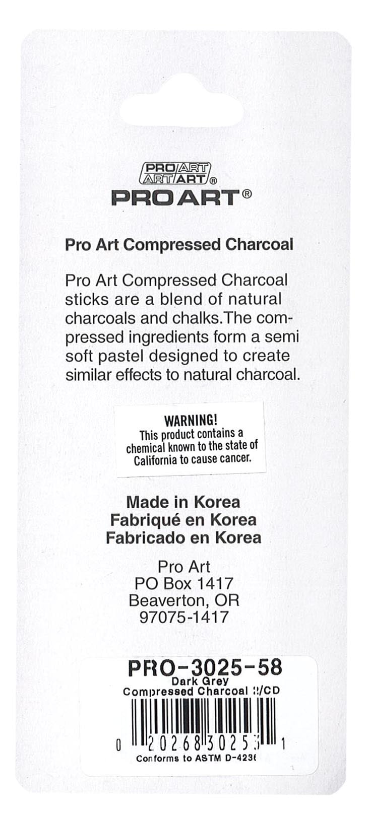 Pro Art Compressed Charcoal Dark Grey 2pc- Made from a blend of natural charcoals and chalks. The compressed ingredients form a semi soft pastel designed to create similar effects to natural charcoal. Blends well. Square stick measures approximately 2.5"x 3/8".Pro Art Compressed Charcoal 2pc Dark Grey Carded