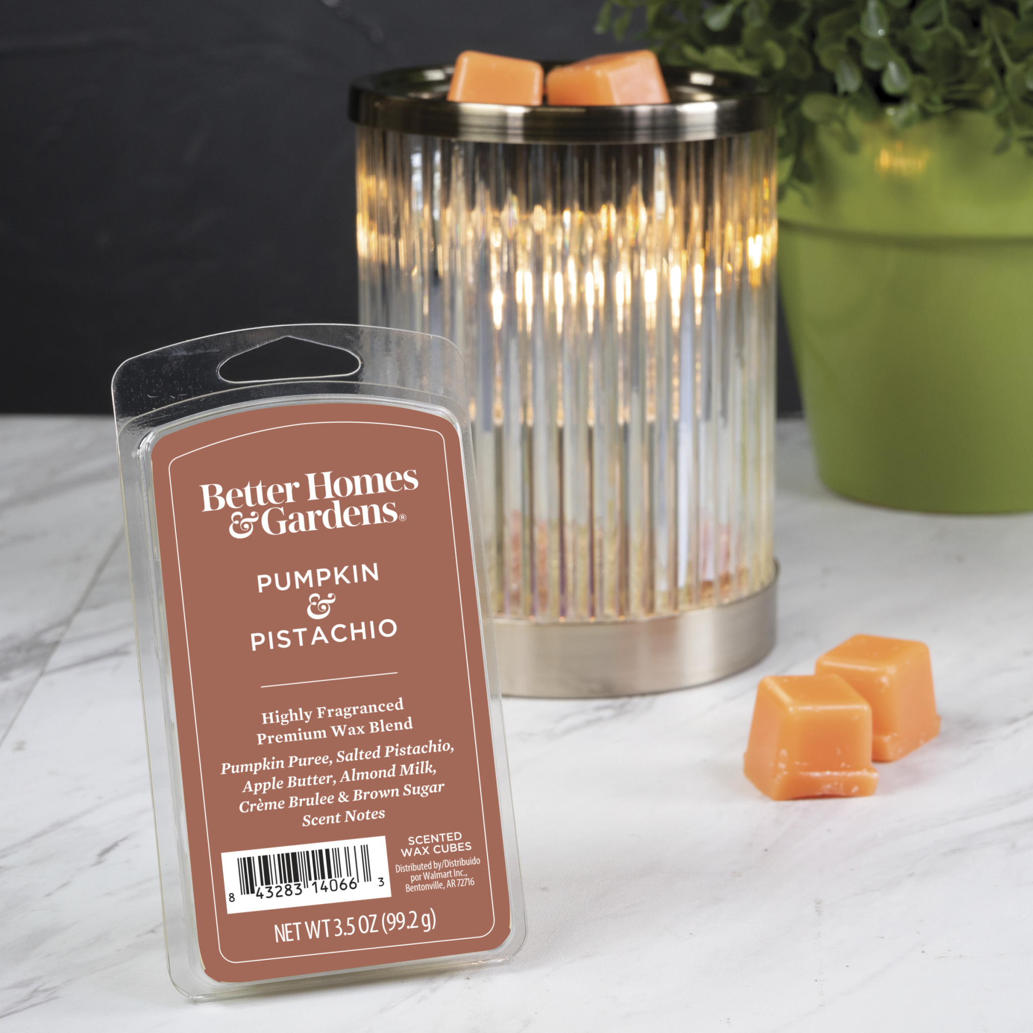 Better Homes & Gardens 3.5 oz Pumpkin & Pistachio Premium Scented Wax Melt features creamy apple butter and slated pistachio blended with the rich notes of brown sugar and almond milk brulee infused with gently spiced pumpkin puree. Better Homes & Gardens 3.5 oz Pumpkin & Pistachio Scented Wax Melts are for use in an fragrance warmer and release a soothing, highly fragrant scent into the air immediately upon melting. These premium wax melts are ideal for spreading a relaxing scent and welcoming atmosphere throughout your home. This premium wax melt line features more fragrance per cube with elevated fragrance notes. Simply break off a piece and add it to your favorite fragrance warmer.