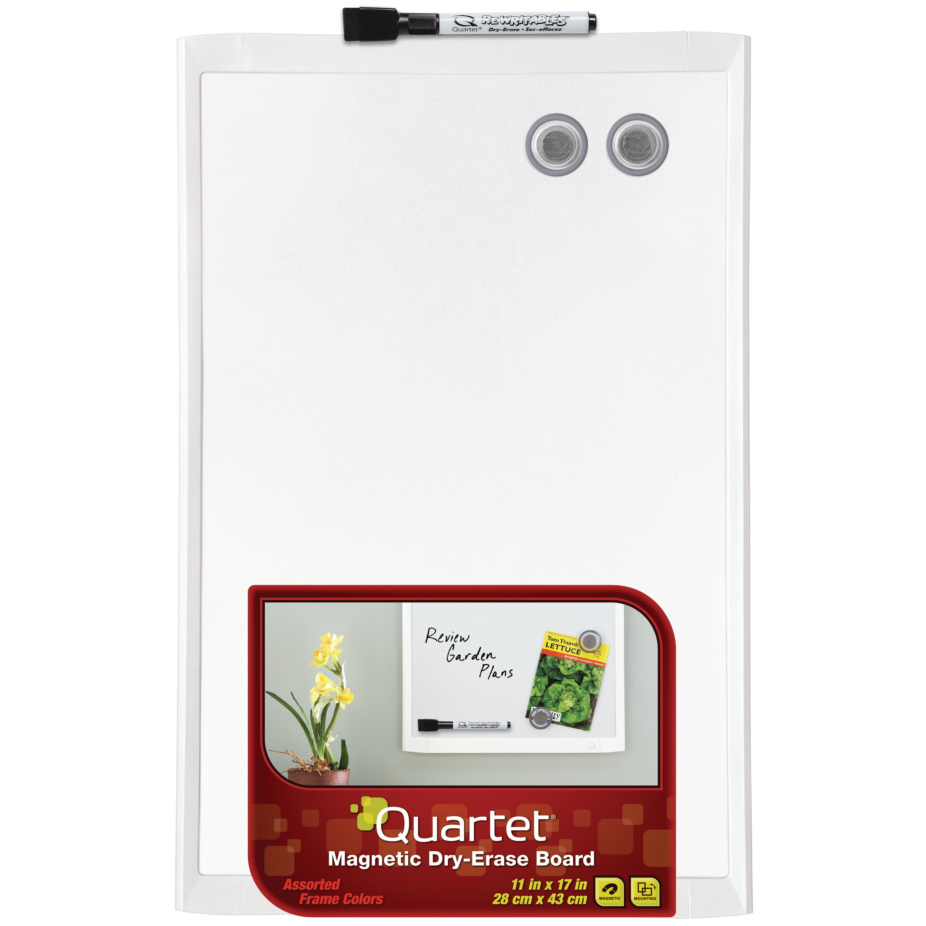 The Quartet Magnetic Dry-Erase Board is the perfect choice use in your home office, cubicle or dorm room. The board’s smooth surface makes writing and erasing effortless, so you can quickly and easily jot down a note and hang items from the board where they will be easily noticed and accessible. And it’s magnetic, so you can easily post papers, photos, reminders and more. This board is best for occasional personal use in small spaces, like home offices and dorm rooms. Its 17" x 11" size fits perfectly in smaller spaces. The white plastic frame gives the board a finished edge. This dry-erase board can be mounted vertically or horizontally to fit your space and messaging needs. Included self-stick mounting hardware makes it easy to mount on most flat surfaces. A Quartet dry-erase marker and magnet accessories are included. For optimal performance, clean it regularly with the separately sold Quartet cleaning solutions.