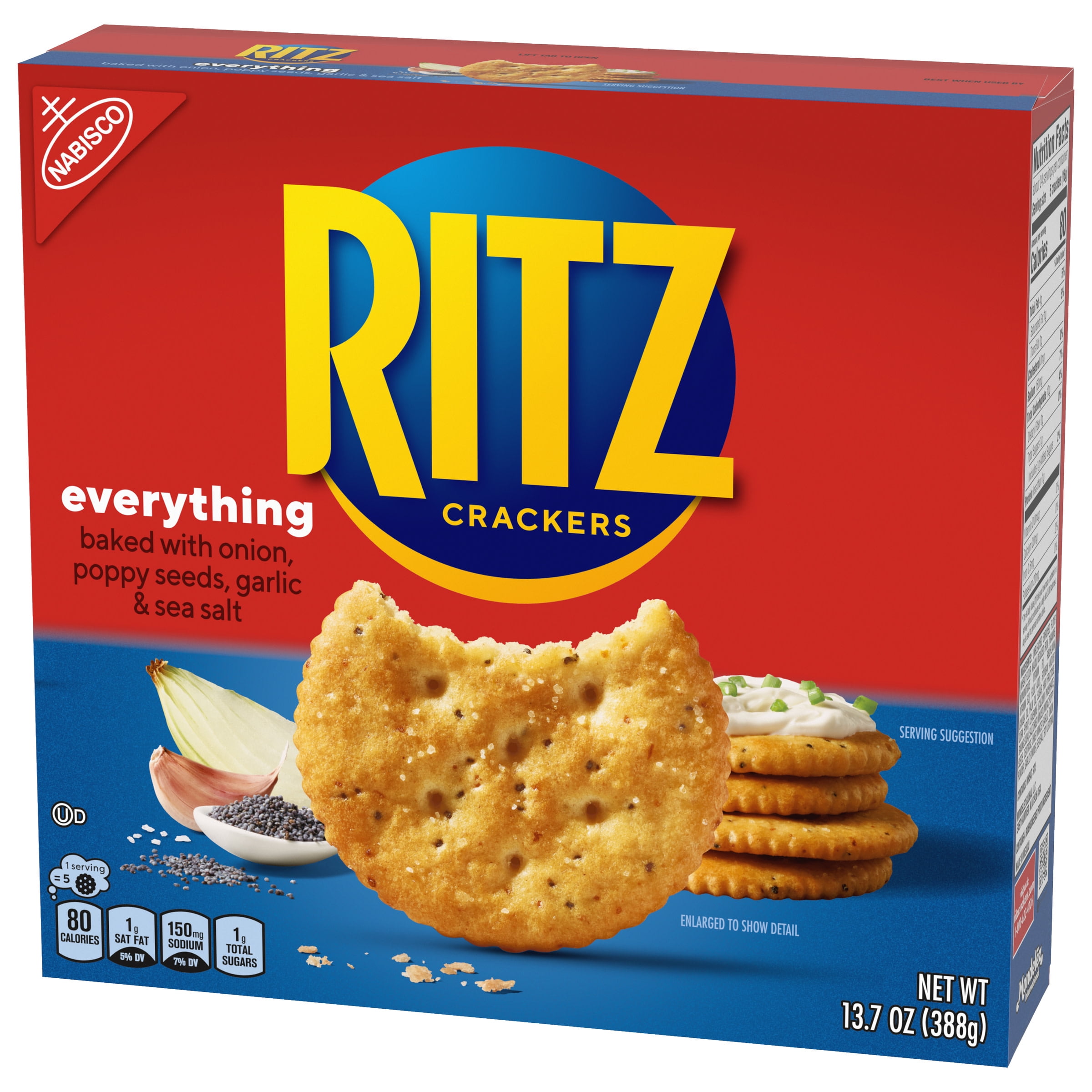 RITZ Everything crackers are the same flaky and delicious RITZ recipe you love, made with an everything seasoning of onion, poppy seeds, garlic and sea salt. RITZ traditional round crackers are a twist on the classic RITZ cracker that pairs well with almost any topping. RITZ Everything Crackers are delicious all on their own too, so keep these kosher dairy everything flavored snacks on your shelf of salty snacks for an easy anytime treat. Each box includes one 13.7 ounce package of RITZ crackers.