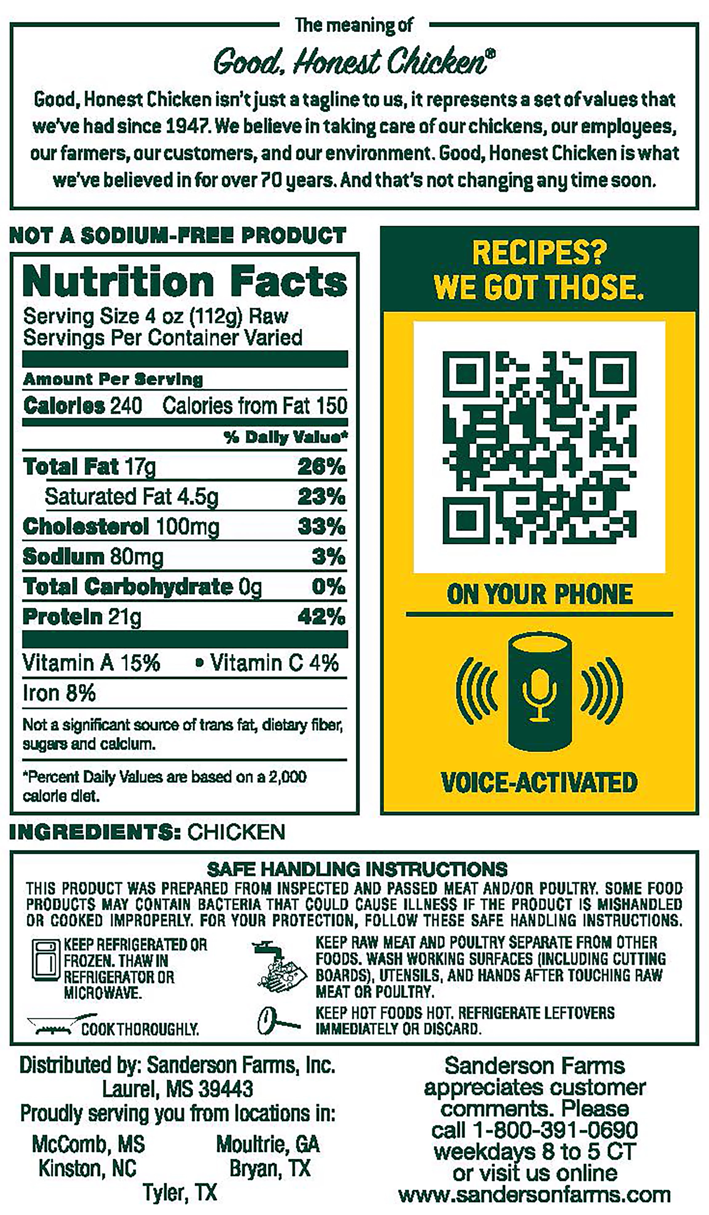 Sanderson Farms Whole Young Chicken is perfect when cooking for a crowd. For cooking inspiration, check out our roasting recipes from the QR code on the front of the package, our voice-activated recipes from your smart speaker, or on sandersonfarms.com. Sanderson Means Fresh, Never Frozen. All of our chicken is hatched, raised, and harvested in the USA. Farm-fresh and ready to amaze your taste buds. In fact, there’s a good chance the chicken you find at your local store was packaged and delivered within 24 hours of harvest.
