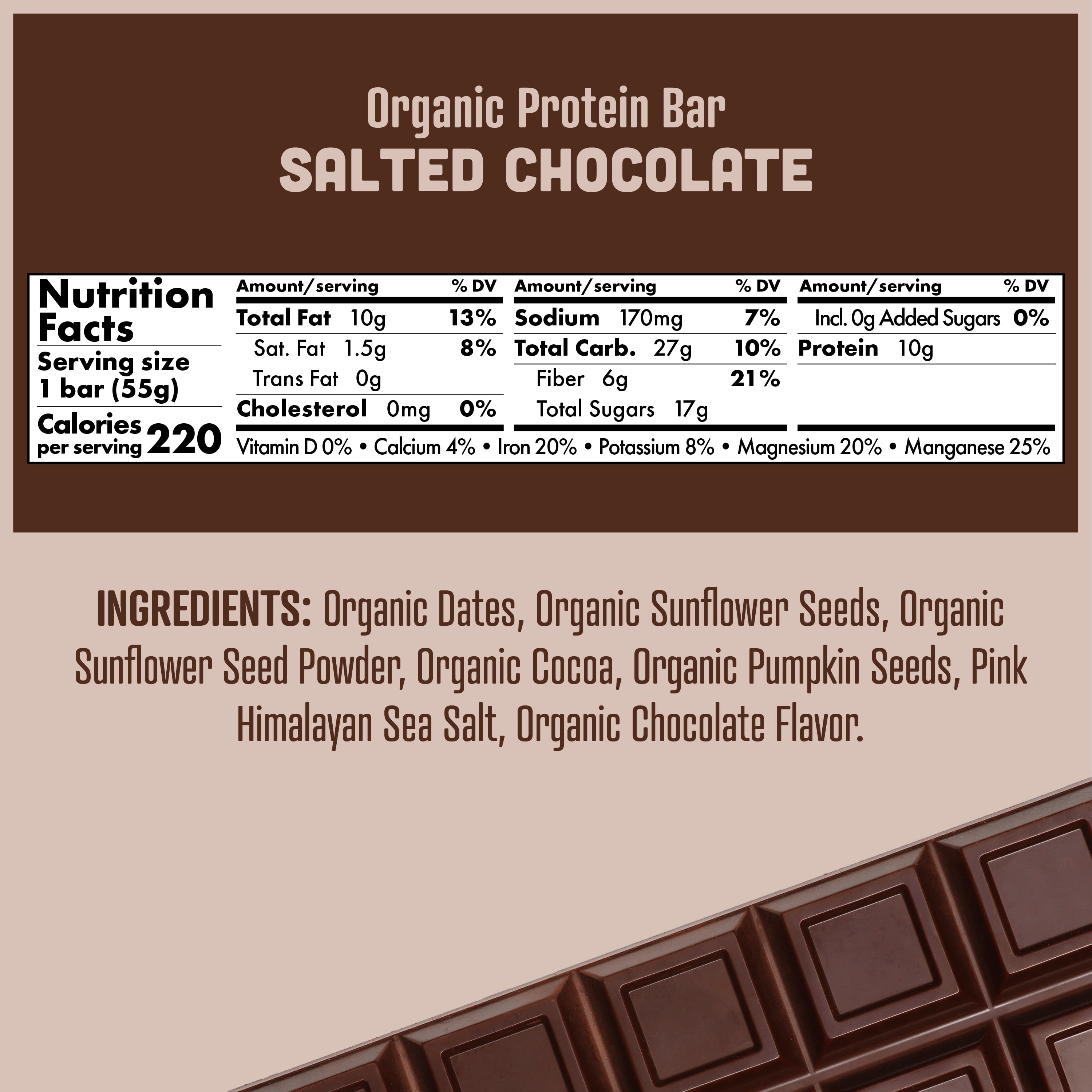 - CLEAN SNACKING & EATING: Our Salted Chocolate protein bars are Certified USDA Organic, Certified Kosher, Vegan, Non-GMO, Gluten-Free, Soy-Free, Grain-Free, and Dairy-Free.