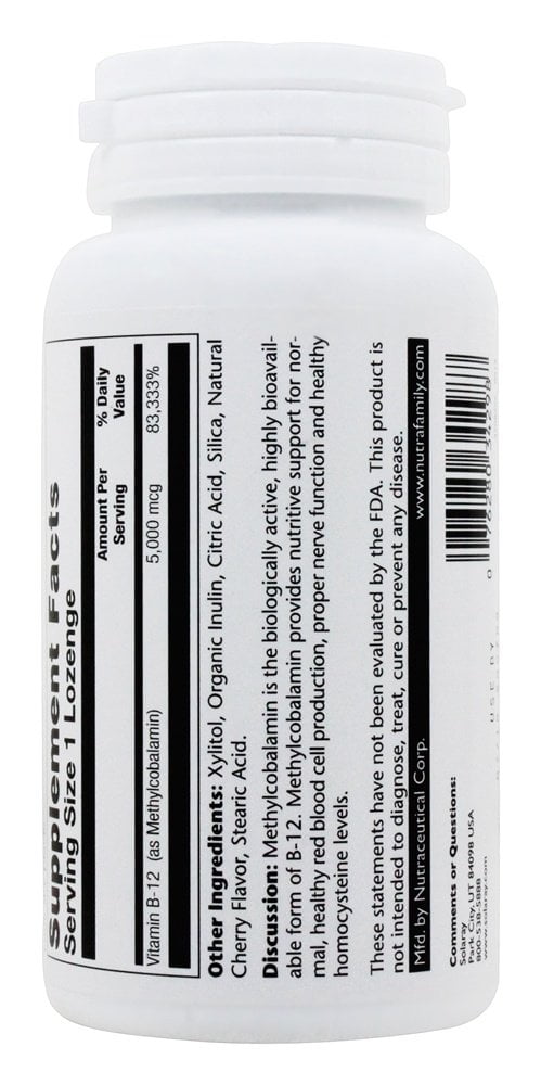 Solaray – Methyl B-12 Cherry 5000 mcg. – 60 Lozenges Solaray Methyl B12 lozenges contain 5000mcg of Vitamin B12. Methylcobalamin is the biologically active, highly bioavailable form of B-12. Methylcobalamin provides nutritive support for normal, healthy red blood cell production, proper nerve function and healthy homocysteine levels. Solaray’s True Selection Solaray takes pride in offering great new products…Solaray – Methyl B12 Cherry 5000 mcg. – 60 Lozenges