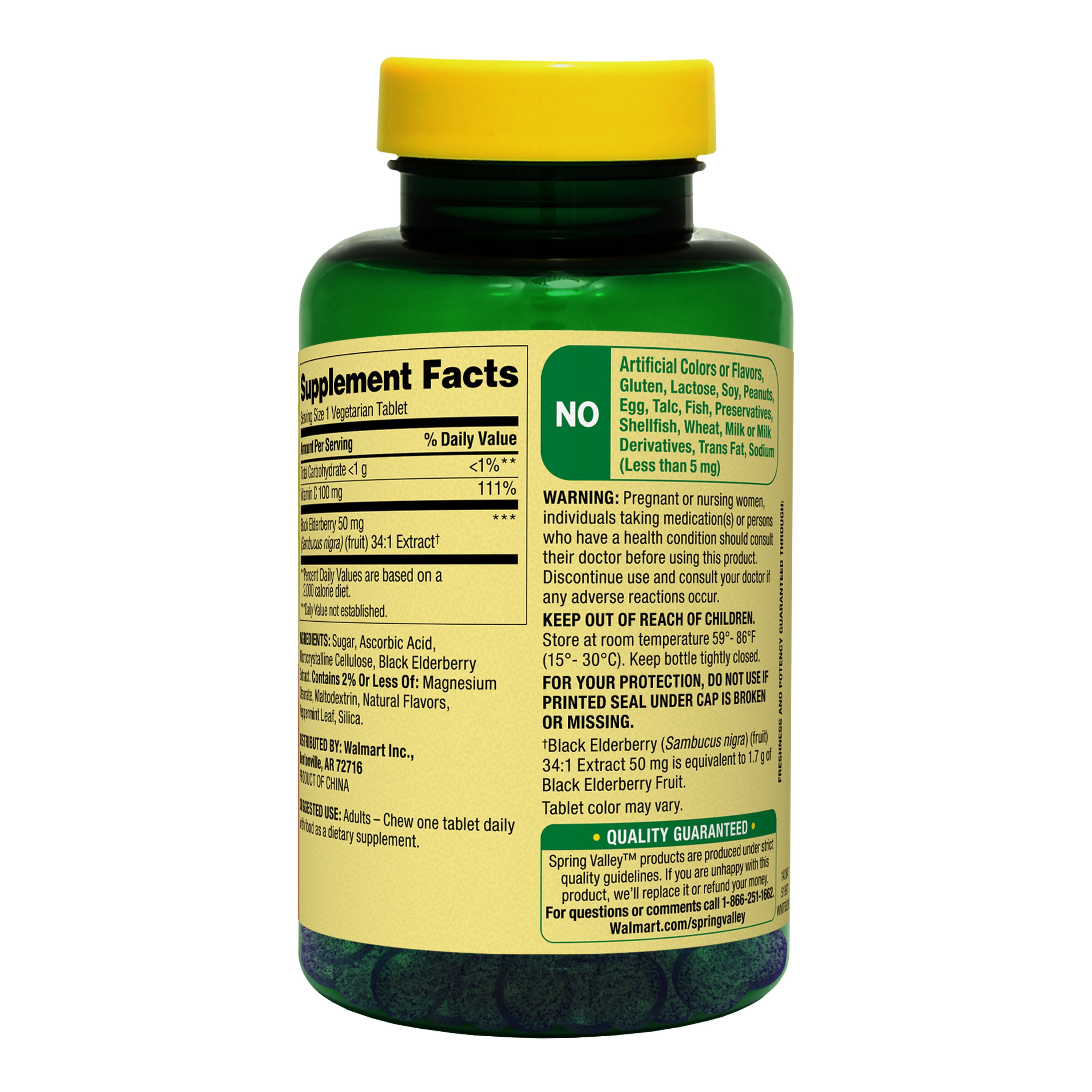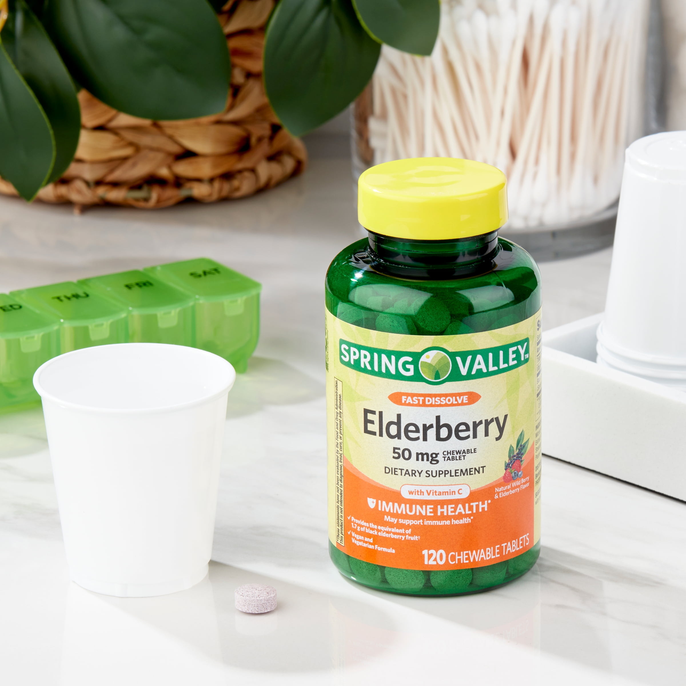 Our Spring Valley Elderberry Chewable Tablets Dietary Supplement, Wild Berry & Elderberry Flavor, 50 mg is formulated to promote immune health.* One tablet delivers 50 mg of black elderberry extract and 100 mg of vitamin C. These chewable tablets feature a delicious natural wild berry and elderberry flavor. They contain no gluten, lactose, soy, preservatives, artificial colors, flavors, or dyes. They are also suitable for vegan and vegetarian diets. You can rest assured that Spring Valley Elderberry Chewable Tablets Dietary Supplement, Wild Berry & Elderberry Flavor, 50 mg, 120 Count is produced with strict quality guidelines and is backed by our quality guarantee.