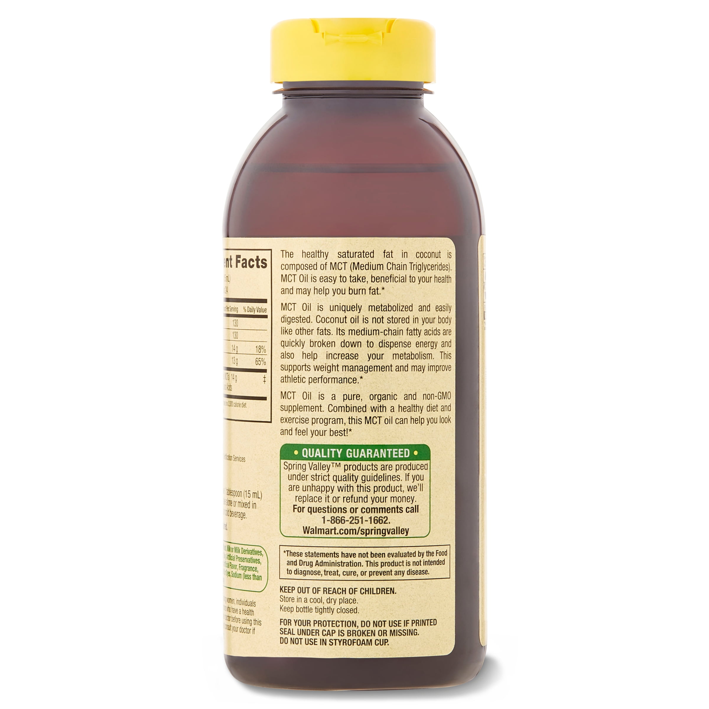 Spring Valley Organic MCT Oil is a pure, USDA Organic supplement made 100% from coconuts. MCT stands for medium chain triglycerides, which are specific fatty acids that are not readily stored in the body like other saturated fats, plus provide a variety of desirable benefits. MCT Oil helps promote fat burning, weight management, cognitive function and provides a valuable source of natural energy.