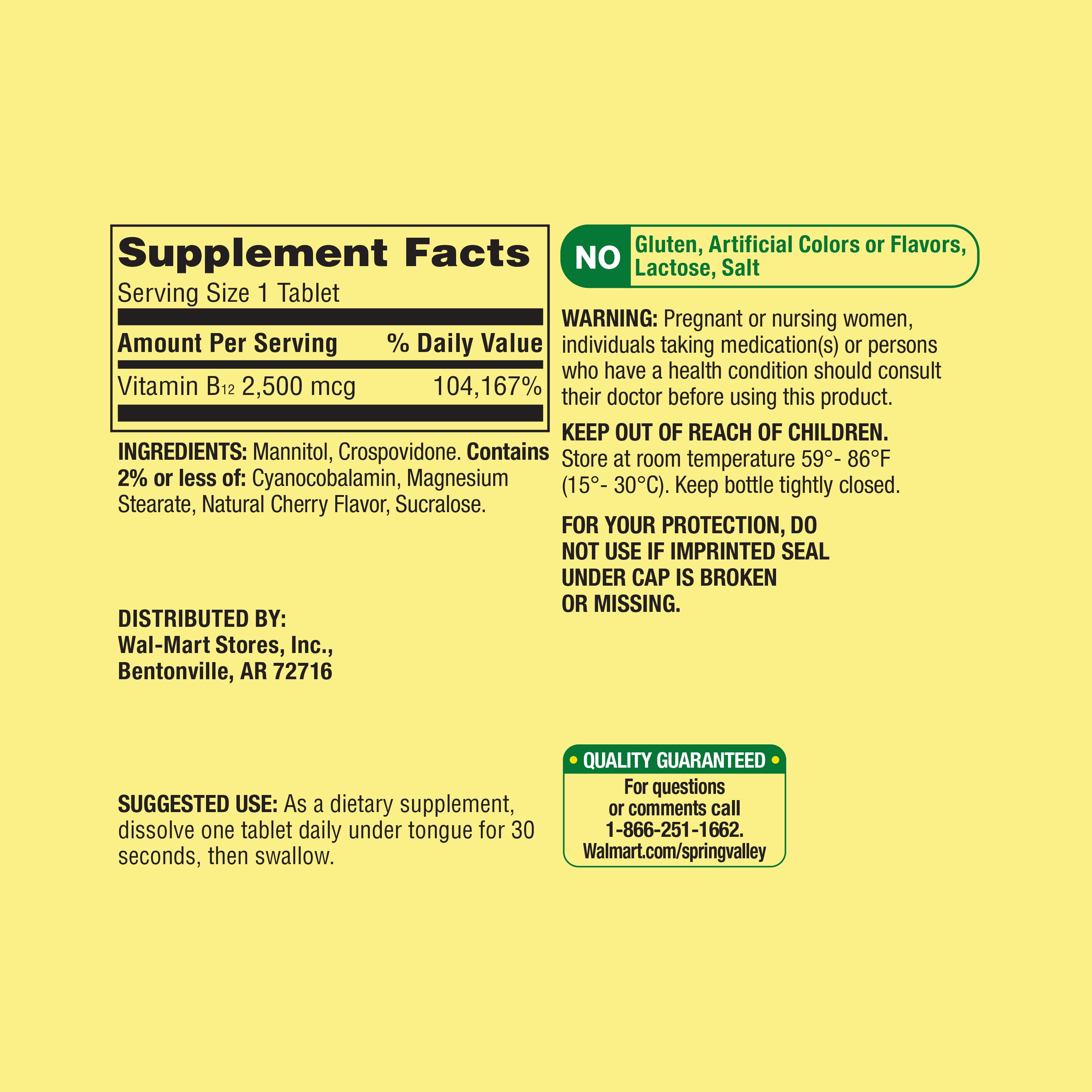 Our Spring Valley Vitamin B12 Quick-Dissolve Tablets Dietary Supplement, 2,500 mcg, Cherry Flavor is a dietary supplement formulated to support energy metabolism and nervous system health.* Each tablet delivers 2,500 mcg of vitamin B12. The formula contains no artificial colors or flavors, salt, gluten or lactose, and is suitable for a vegetarian diet. These fast-dissolve tablets feature a delicious natural cherry flavor. The suggested adult dosage is one tablet per day, dissolved under the tongue for 30 seconds and then swallowed. You can rest assured that Spring Valley Vitamin B12 Quick-Dissolve Tablets Dietary Supplement, 2,500 mcg, Cherry Flavor is produced with strict quality guidelines and is backed by our quality guarantee.