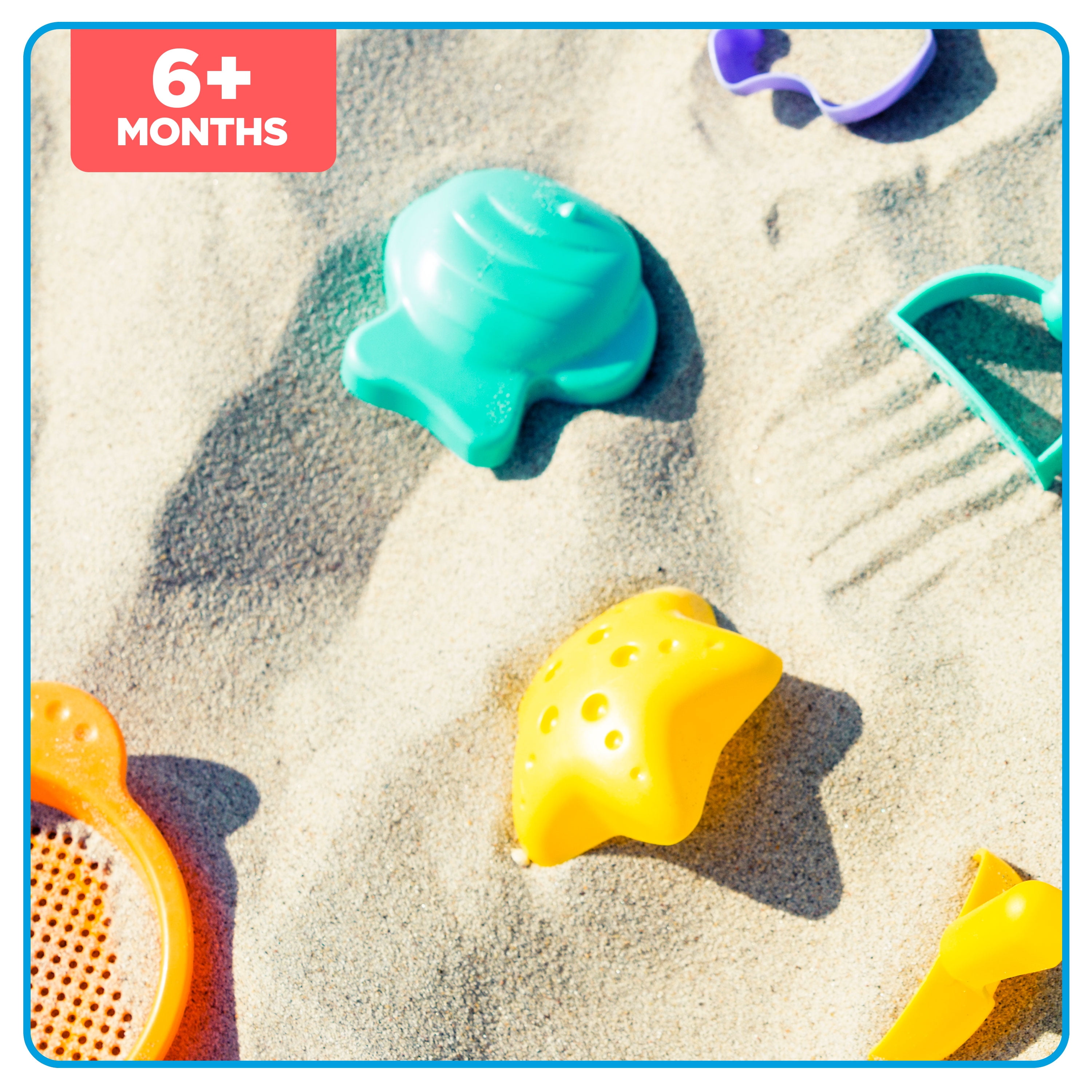 Little hands will love scooping water and making sand creations with our Infant Unisex Multi-Color 18-piece Swim School Scoop N Splash Sea Friends set. This mix-and-match set includes an array of fun sea creatures, such as a fish, a crab, a seashell, an octopus, a seahorse, and a starfish in a variety of bright colors that your young beachcomber will immediately recognize. This sand-and-water-friendly set is packed with so much fun. Kids and Infants can begin to recognize and recall their primary colors of red, yellow, blue, orange, and green as well as the creatures in the set! The Scoop N Splash Sea Friends set contains 18 colorful sea creature-themed molds and is recommended for children ages 6-24 months.