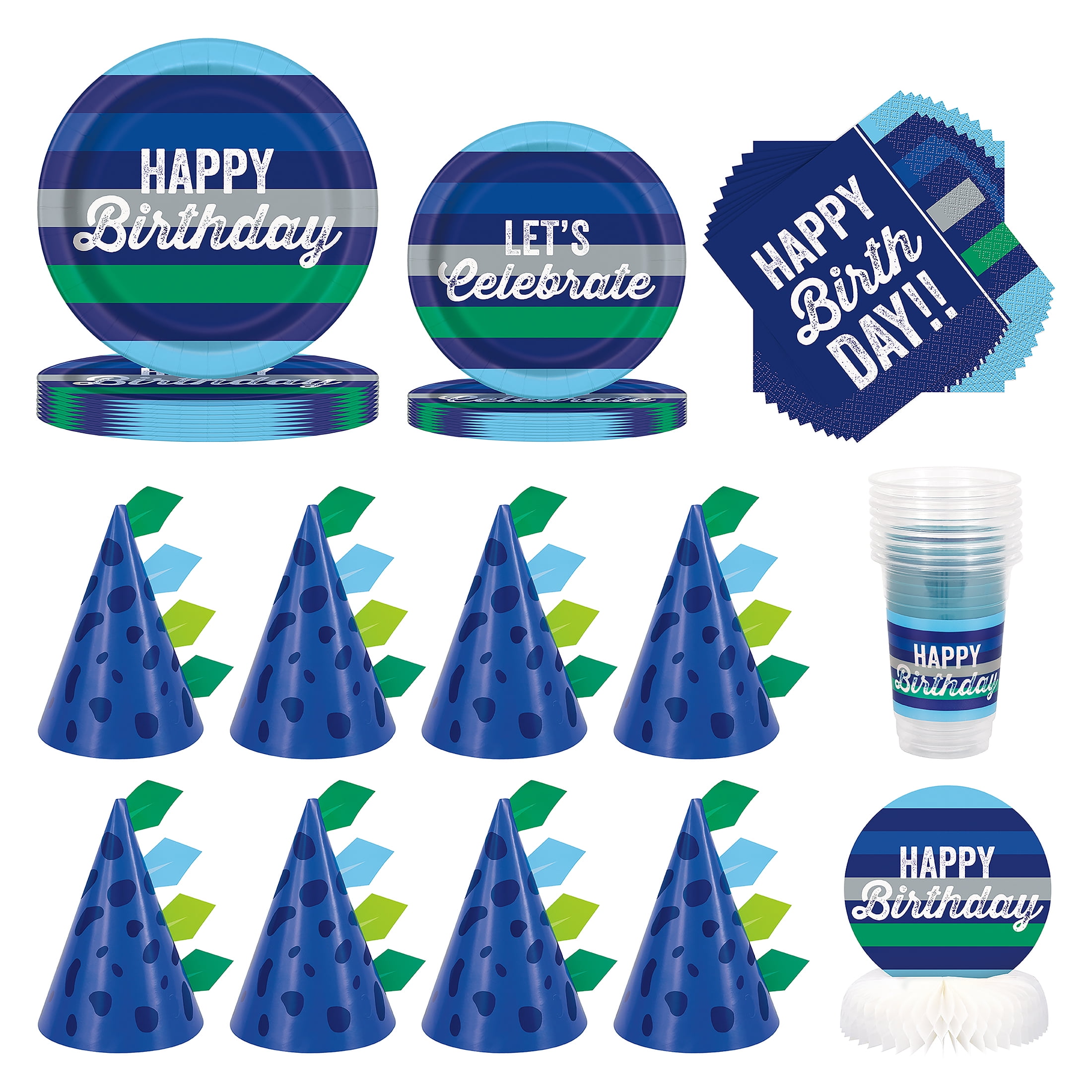 Way to Celebrate! Blue and Green Stripe Birthday Party Tableware and Decoration Kit for 8