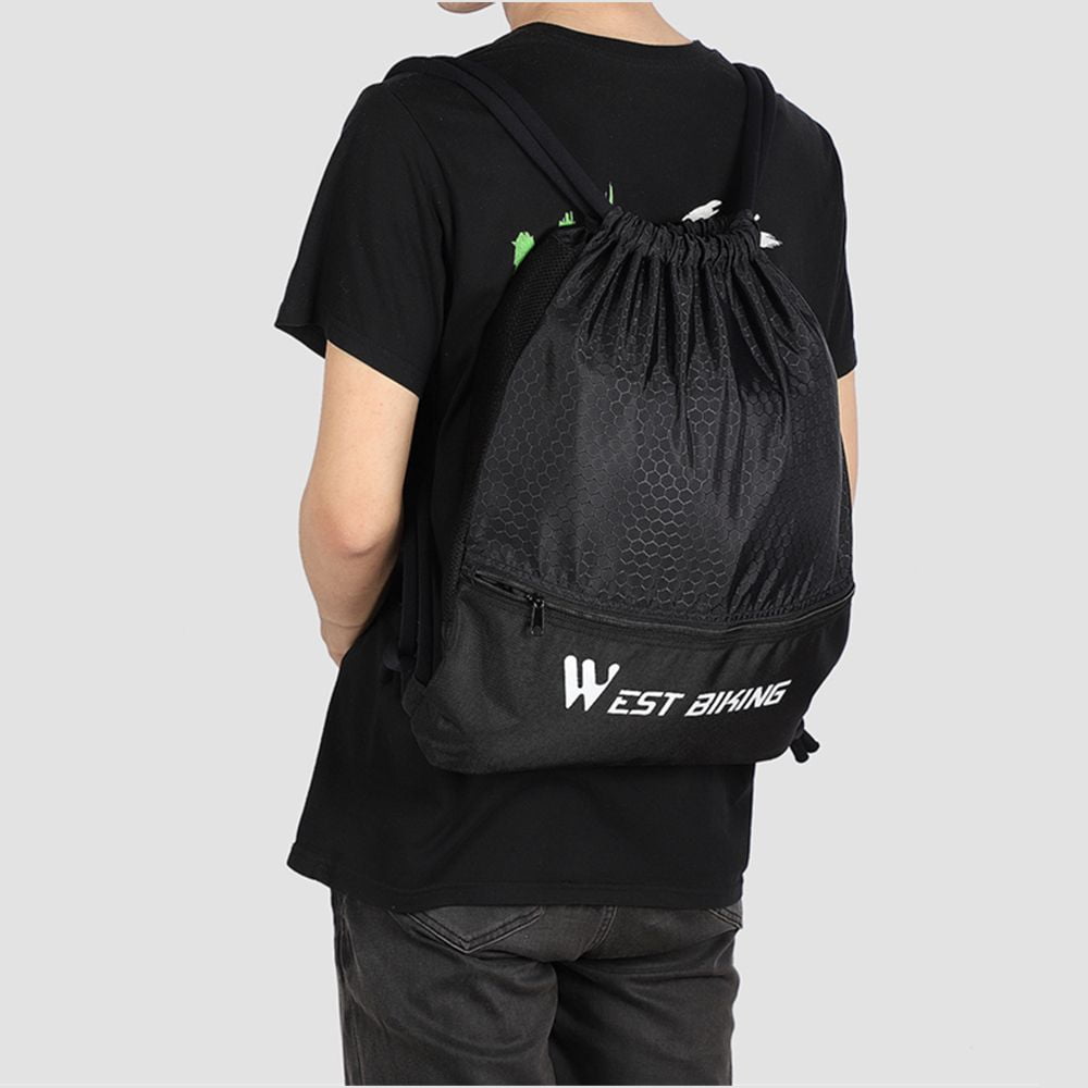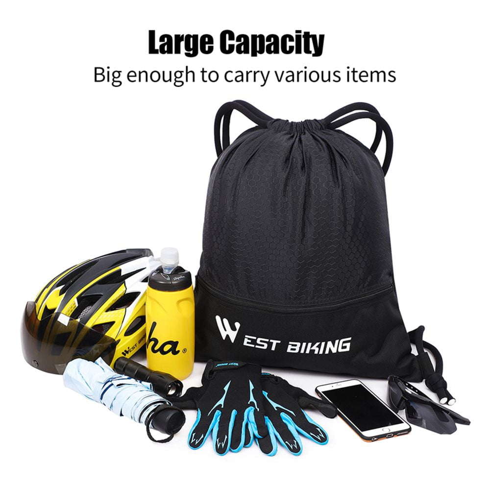 The drawstring sports backpack measures 16" x 18", which is big enough for carrying a variety of items, such as gym clothing & shoes, swim gear, sports towels, soccer ball, and daily supplies, it can also hold a basketball, football, rugby, etc. The drawstring bag is 240g ultralightweight design, great for cycling, gym, sports, yoga, dance, travel, carry-on, luggage, camping, hiking, teamwork, training, and more!