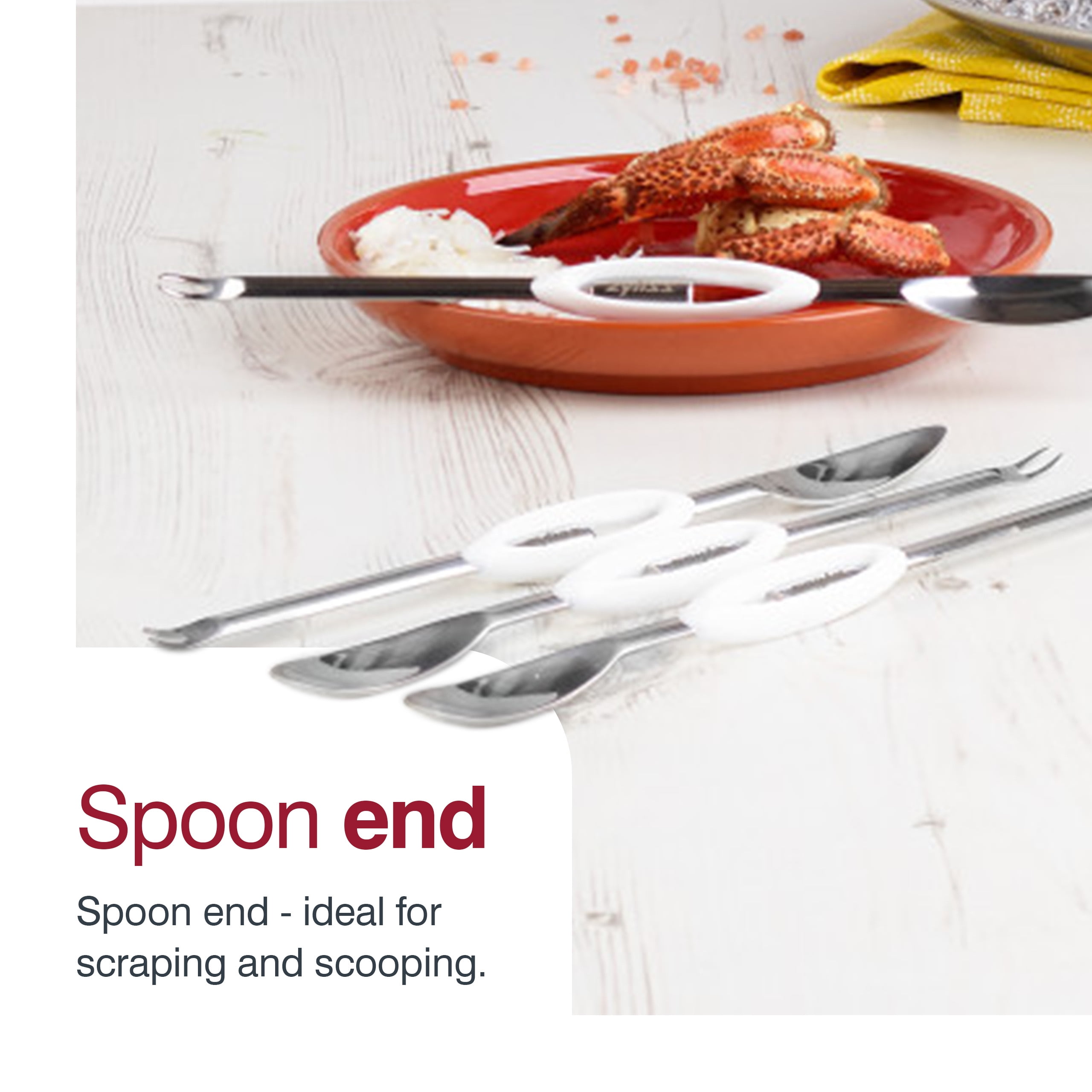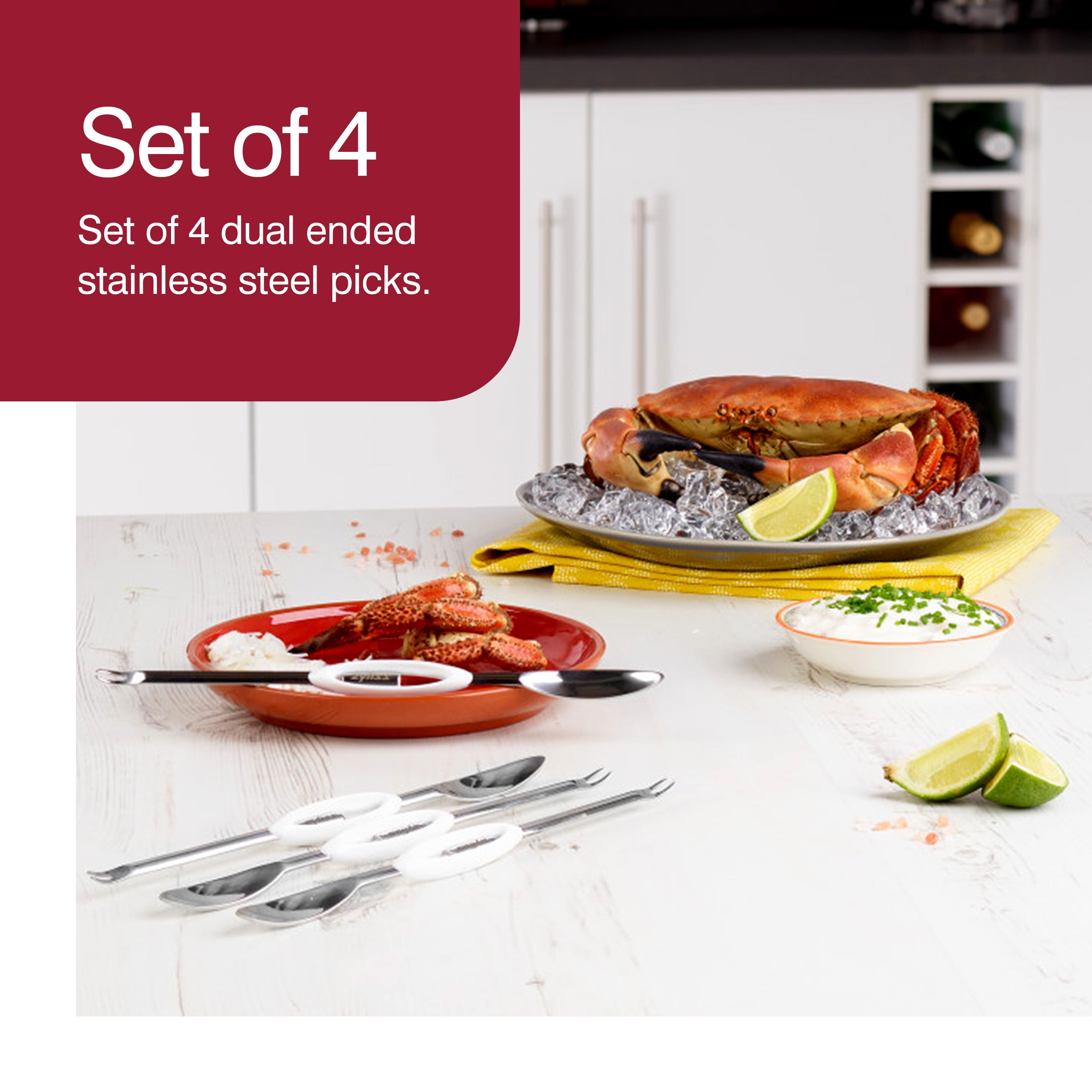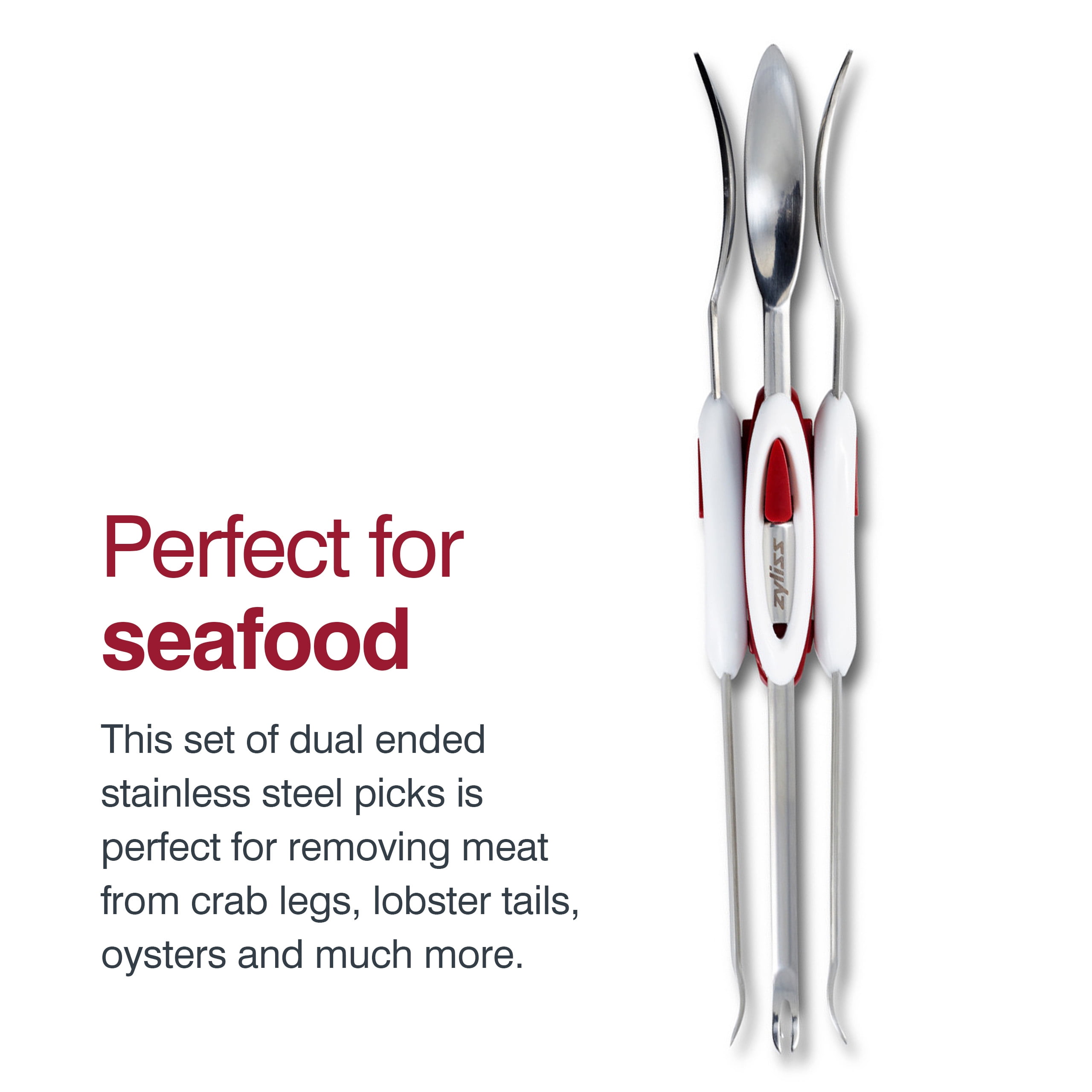 Enjoy a mess-free seafood experience with Zyliss Seafood Picks. This set of dual ended stainless steel picks is perfect for removing meat from crab legs, lobster tails, oysters and much more. You can pick and pull at difficult-to-reach spots with the fork end. You can then flip to the spoon end and you’ll have access to a seafood tool that’s ideal for scraping and scooping oysters.