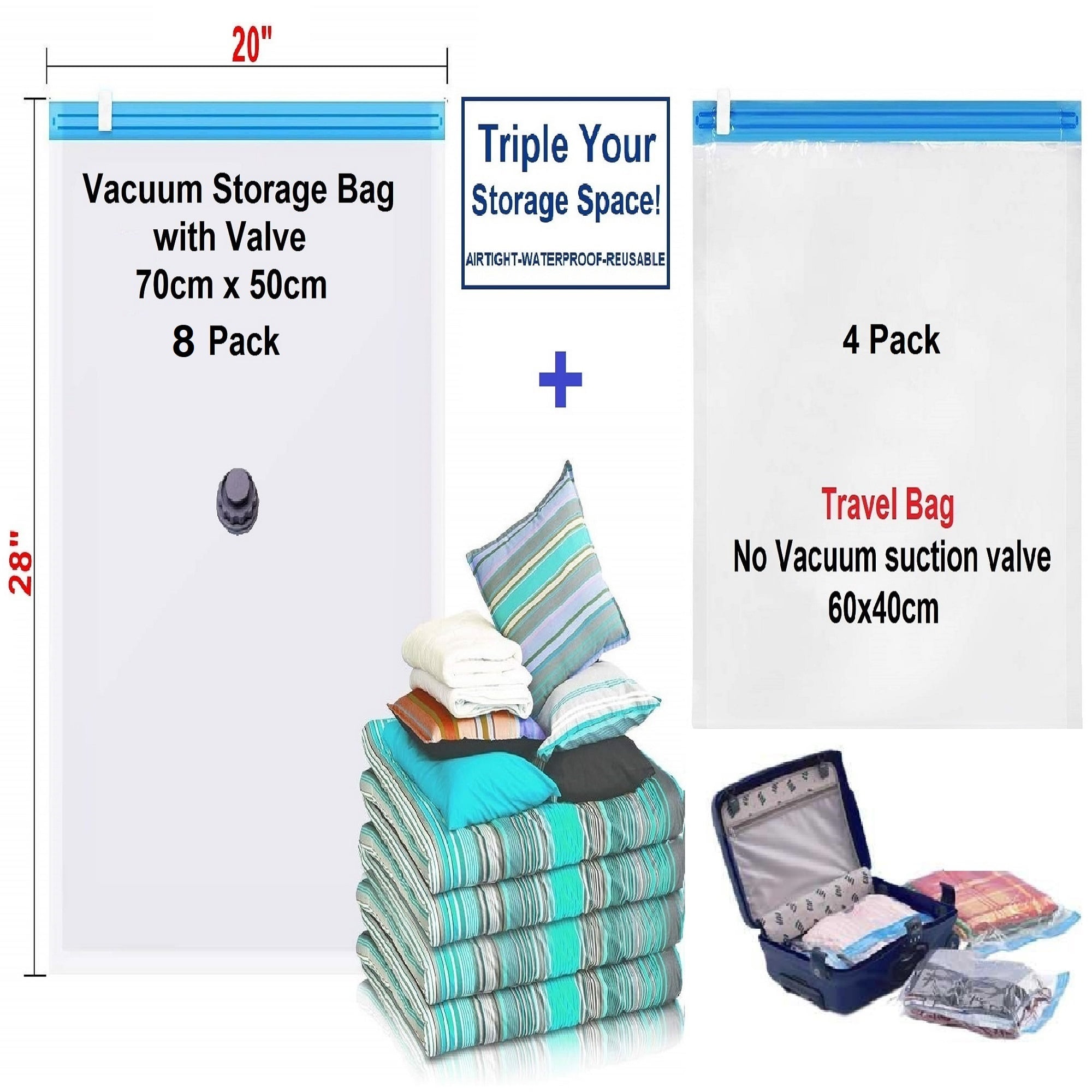 12 Pack – 8 Large Vacuum Seal Space Saver Storage Compress Bags + 4 Travel Bag with 80% More Compression