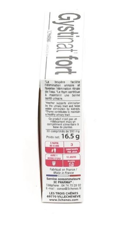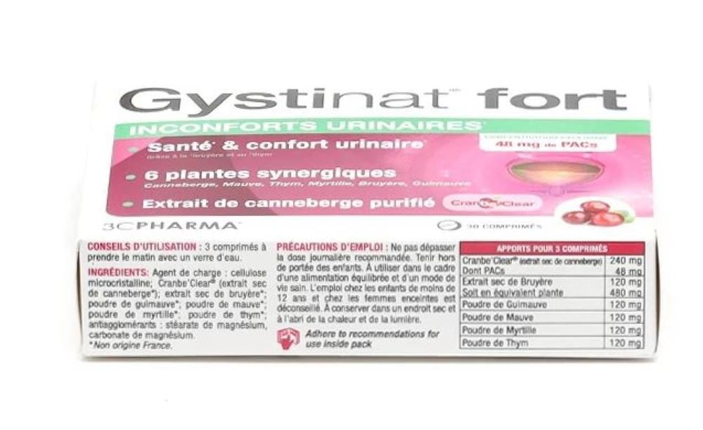 Gystinat Fort is a food supplement offered by the Les 3 Chenes Laboratory. It contains plant extracts and is indicated in case of urinary discomfort. Urinary comfort is the concern of many women. Inconveniences such as a constant urge to urinate or pressure in the lower abdomen can interfere with daily life. It is necessary to act at the first signs of discomfort. In case of recurrent discomfort, regular action is recommended. Gystinat Fort is formulated with plant extracts, including an objectified active ingredient: Cranbe Clear (purified cranberry extract). It will act in synergy by promoting renal and urinary elimination and maintaining lasting urinary comfort. This complex contains an exclusive dose of 48 mg of PACs (proanthocyanidins) as well as thyme which contributes to good urinary health. Mallow, blueberry, and marshmallow complete the formula of Gystinat Fort.