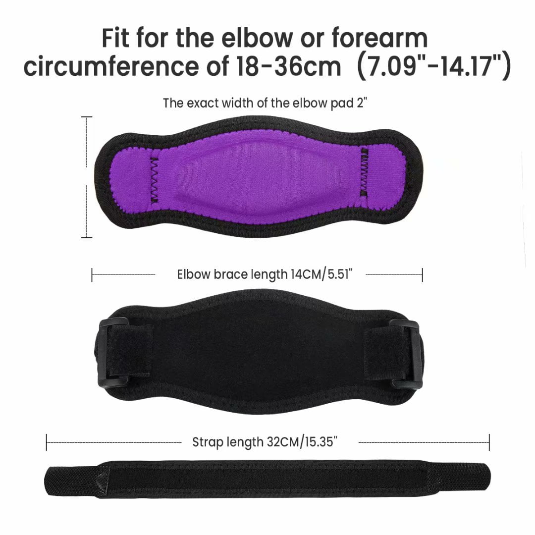 Forearm Size & Adjustable Straps — Fit for the elbow or forearm circumference of 7.09”-14.17”, Reinforced with wide neoprene, the exact width of the elbow pad 2”. Adjustable Straps can be adjusted its tightness.