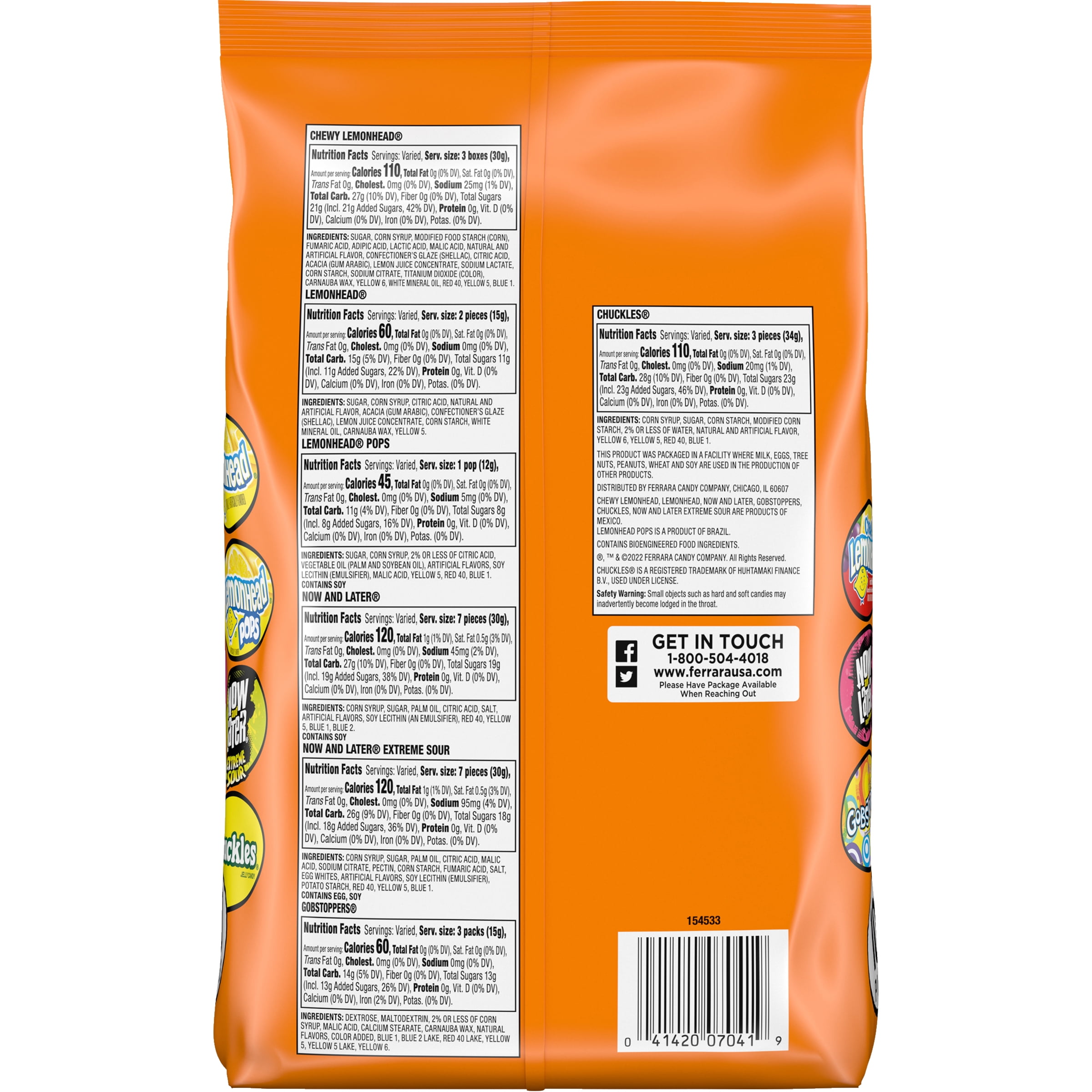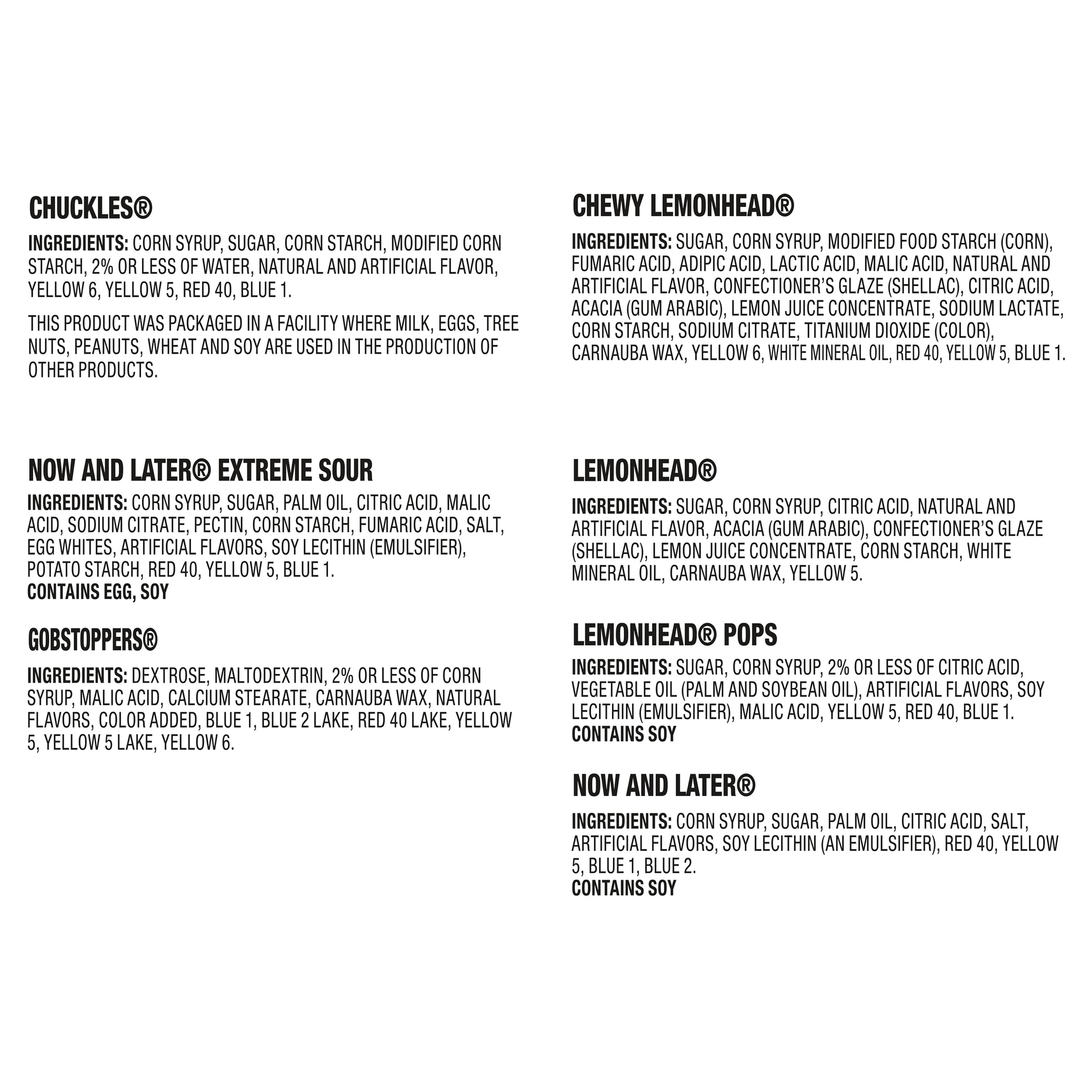 - Assortment includes Lemonhead, Chewy Lemonhead Fruit Mix, Lemonhead Pops, Now & Late, Now & Later Extreme Sour, Gobstopper, and Chuckles