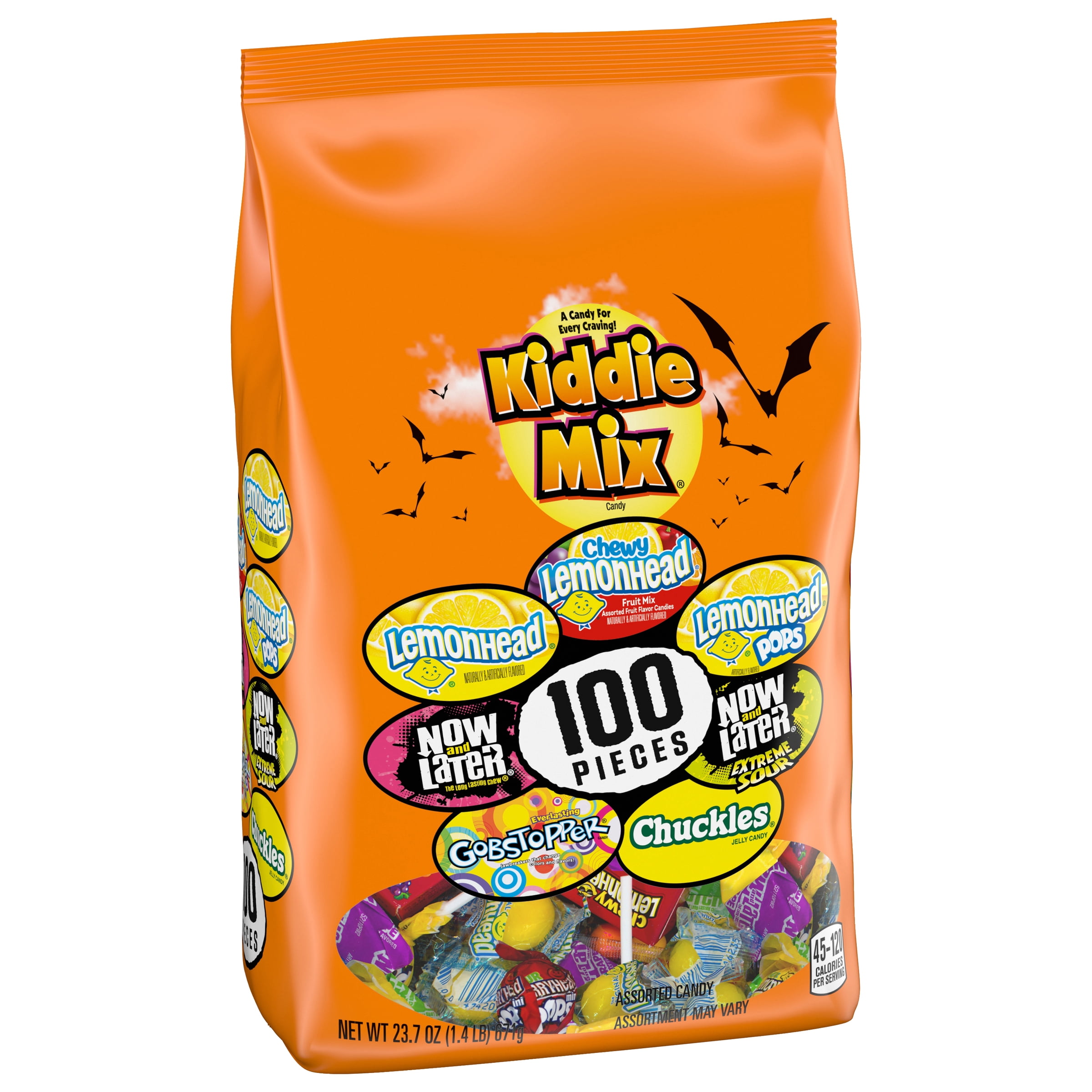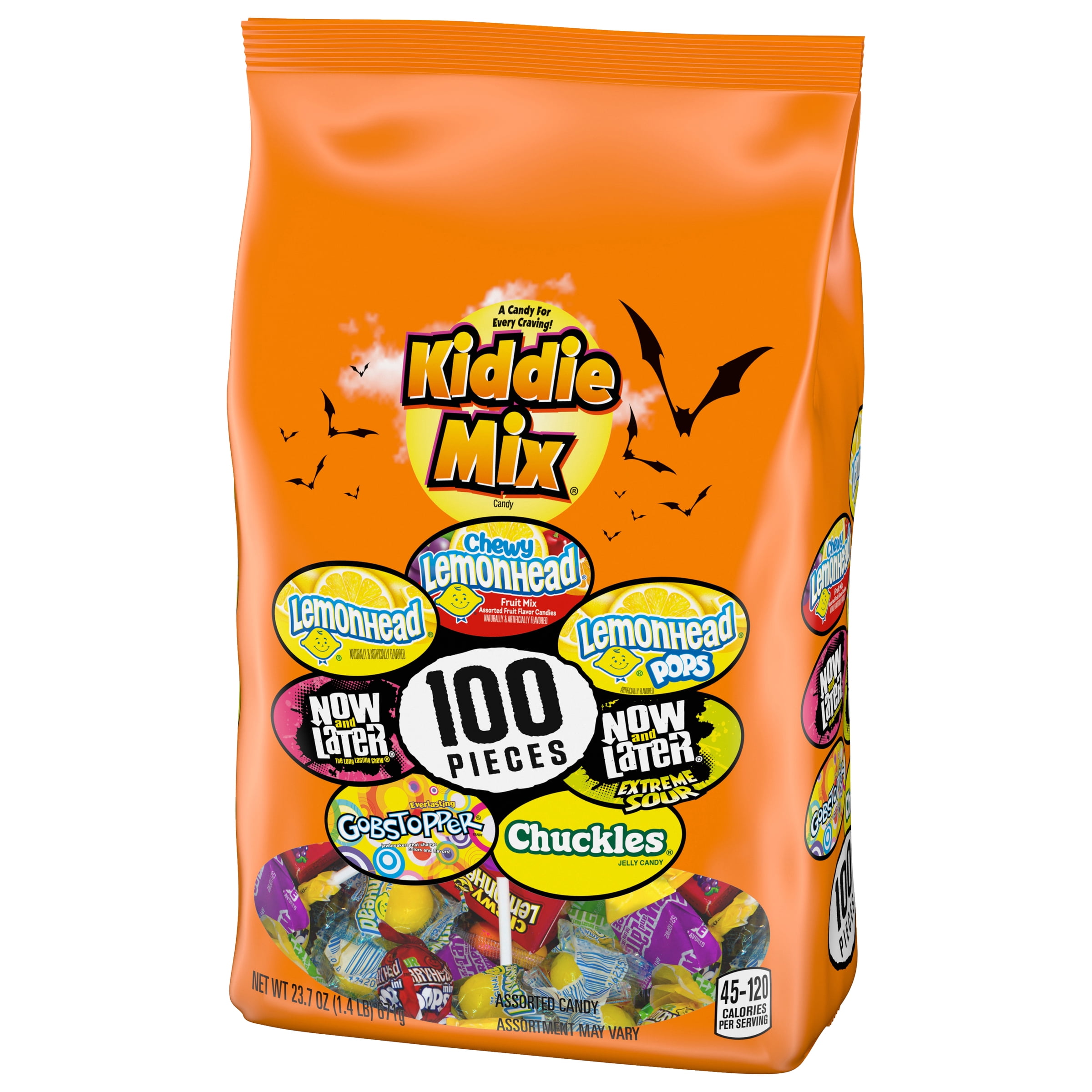 Cover all your Halloween bases with a candy for every craving in this bag of 100 individual trick-or-treat sweets. This Kiddie Mix has scrumptious candies for sweet cravings. Enjoy great tastes like Lemonhead, Chewy Lemonhead Fruit Mix, Lemonhead Pops, Now & Late, Now & Later Extreme Sour, Gobstopper, and Chuckles. Whether you’re refiling your Halloween candy bowl or stocking your classroom sweets stash, this pack of candy will come in handy.